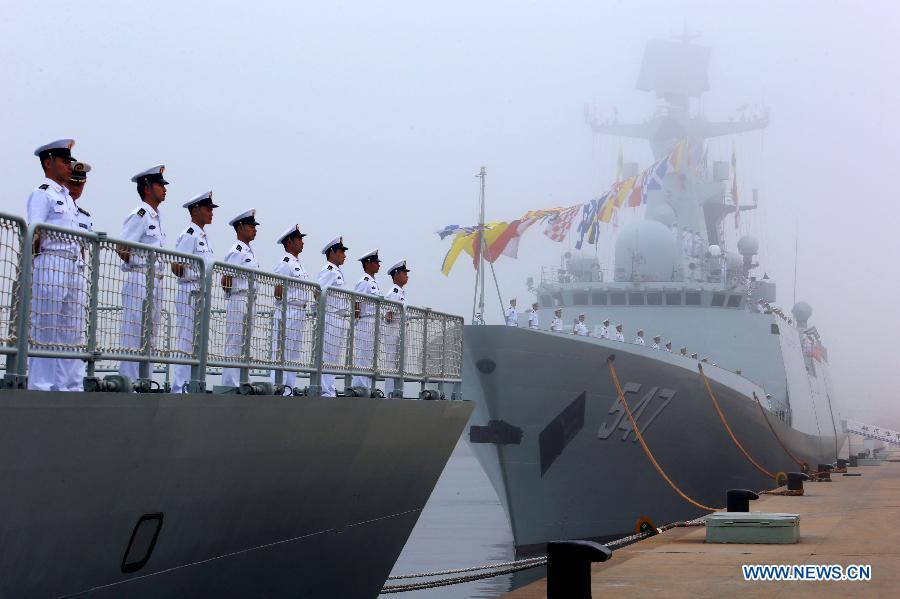 Chinese naval personnel take part in a ceremony for the departure of a fleet in the port of Qingdao, east China's Shandong Province, July 1, 2013. A Chinese fleet consisting of seven naval vessels departed from east China's harbor city of Qingdao on Monday to participate in Sino-Russian joint naval drills scheduled for July 5 to 12. The eight-day maneuvers will focus on joint maritime air defense, joint escorts and marine search and rescue operations. (Xinhua/Zha Chunming)