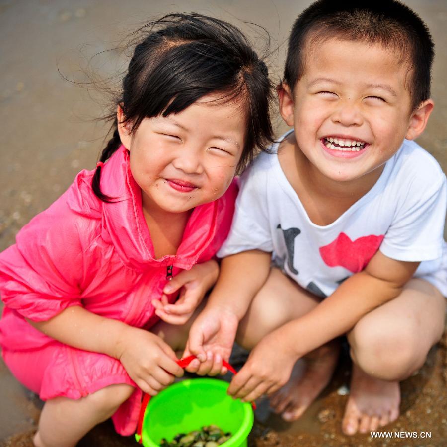 Children carry a bucket of shells on the bathing beach in Dongjiangwan of north China's Tianjin Municipality, June 30, 2013. Many people came to Dongjiangwan to spend their weekends. (Xinhua/Zhang Chaoqun)