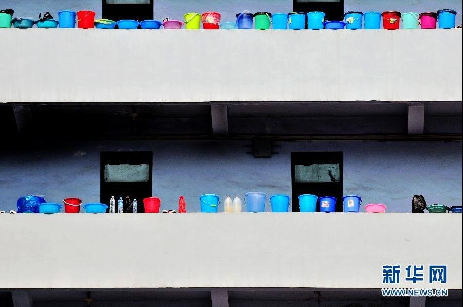 Students of Hubei University of Arts and Science put water buckets under the scorching sun, as a green way to get bathing water on July 1, 2013. The lingering heat persists in Central China's Hubei province recently. [Photo: Xinhua/Pan Awen]