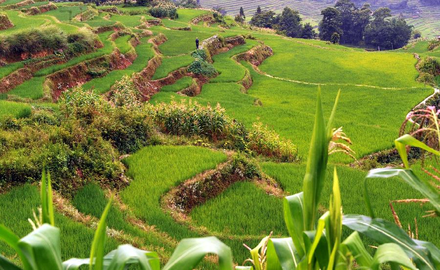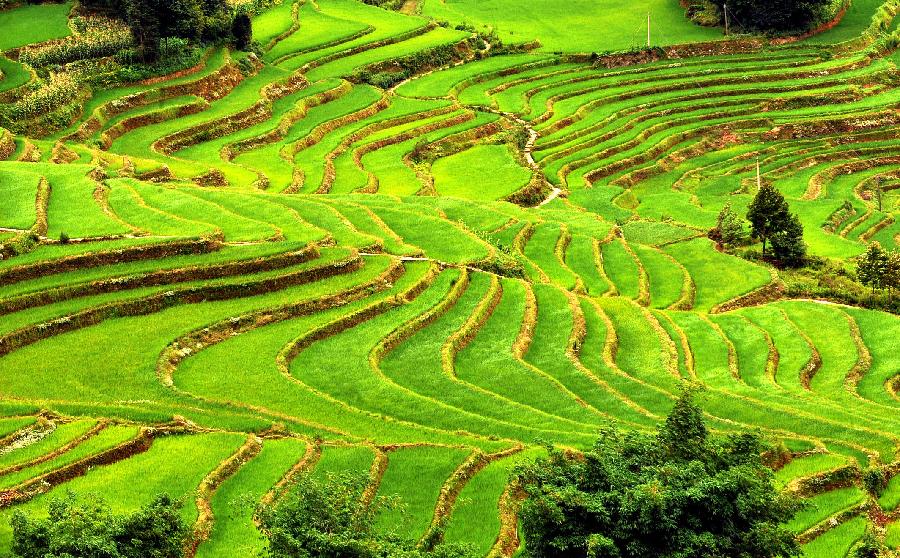 Photo taken on June 29, 2013 shows paddy fields in Quanfuzhuang of Xinjie Town in Yuanyang, southwest China's Yunnan Province. With abundant rainfall, rice grows well this summer in the terraced fields here. (Xinhua/Chen Haining)