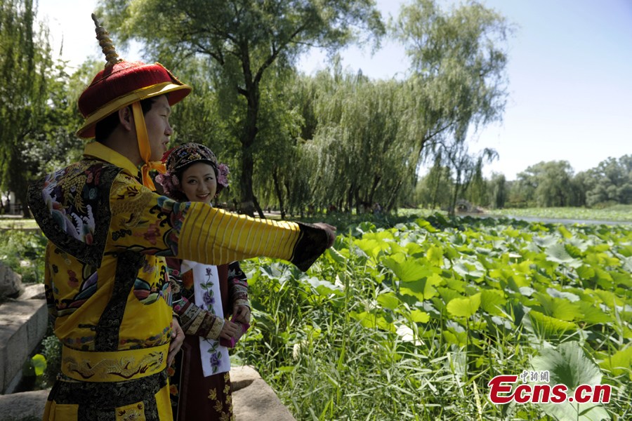 A man in the costume of Emperor Yong Zheng in Qing Dynasty (1644-1912) and a woman in the costume of Zhen Huan, one of Yong Zheng's concubines, visit the Old Summer Palace in Beijing, July 2, 2013. The 18th Lotus Festival kicked off in the park on Tuesday. [Photo: CNS/Cun Nan]