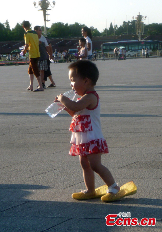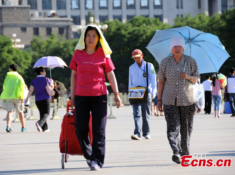 Tourists walking on the Tiananmen Square in Beijing, capital of China, take measures to beat the heat. Beijing Municipal Meteorological Station issued a blue high temperature alert on Tuesday. The maximum temperature in Beijing is expected to climb above 35 degrees Celsius Thursday. [Photo: IC]
