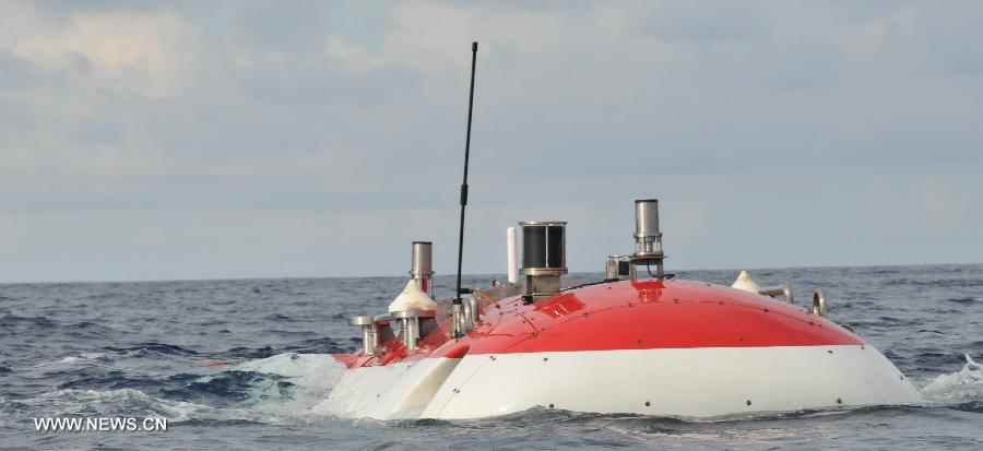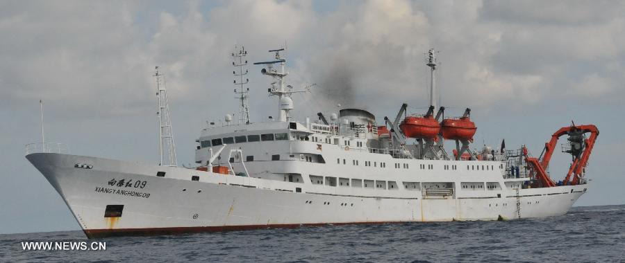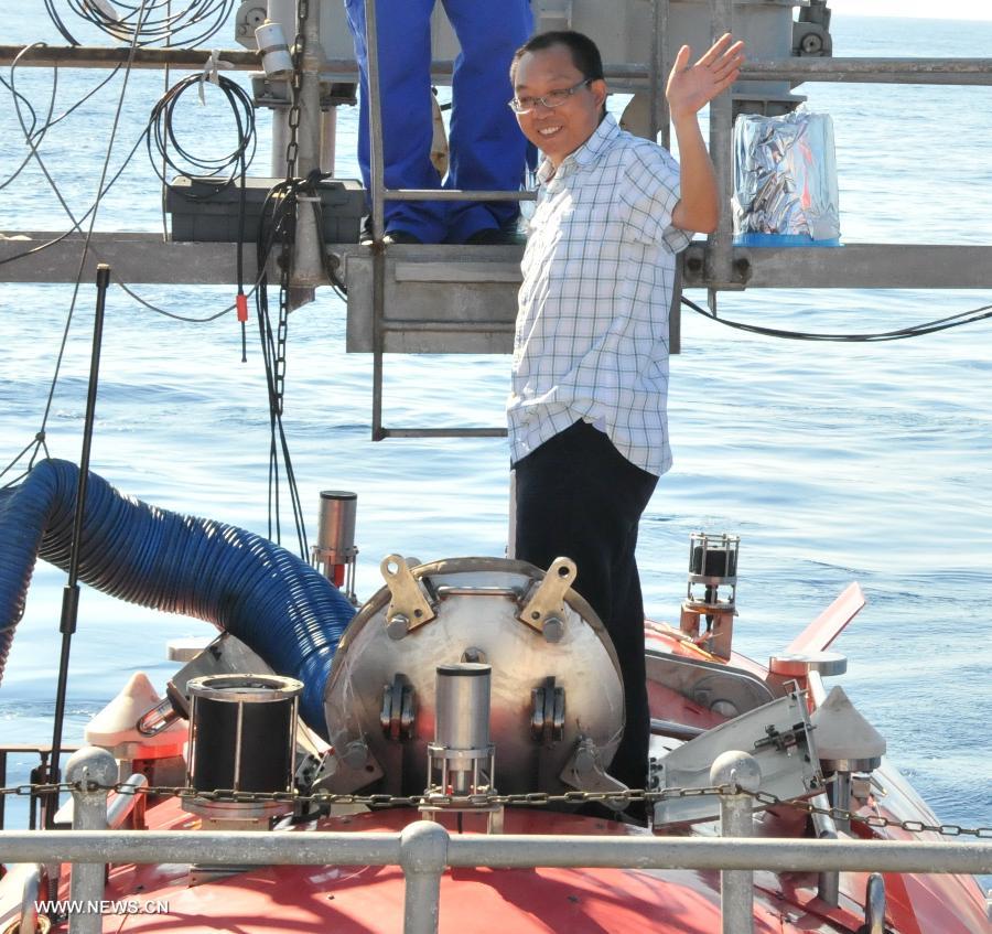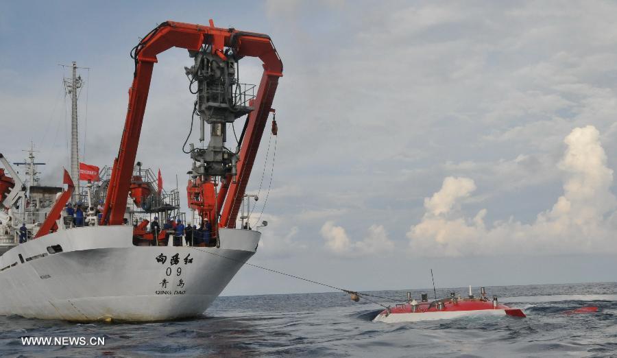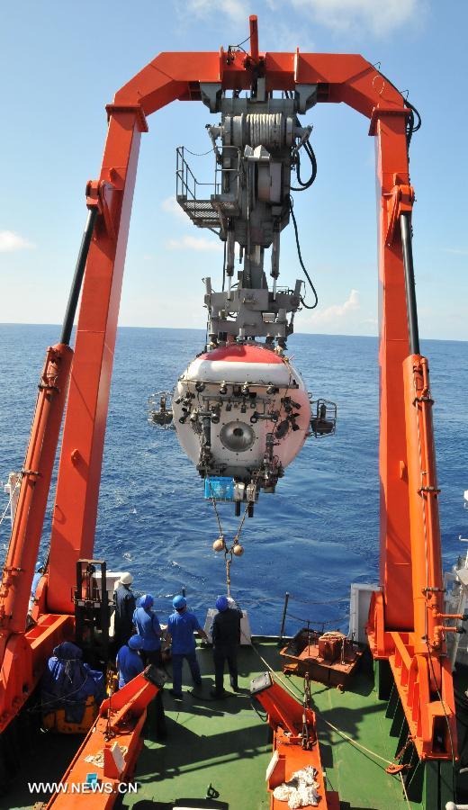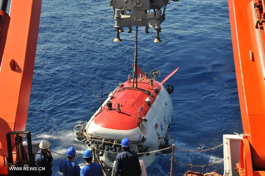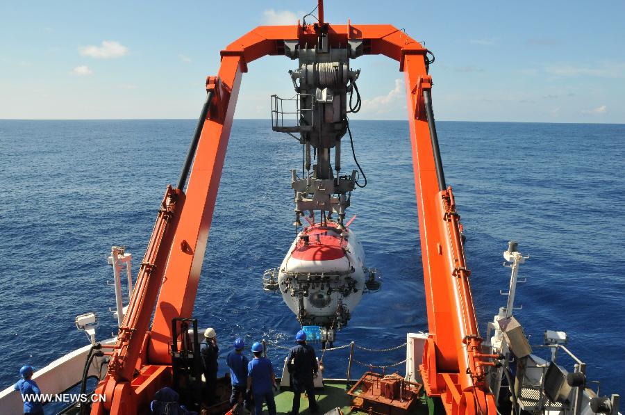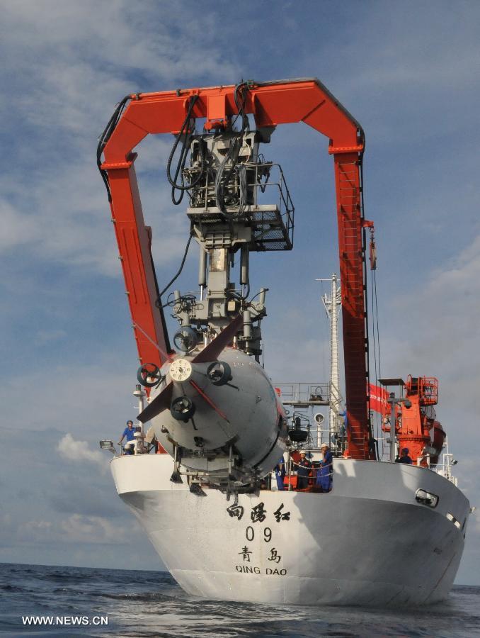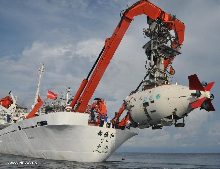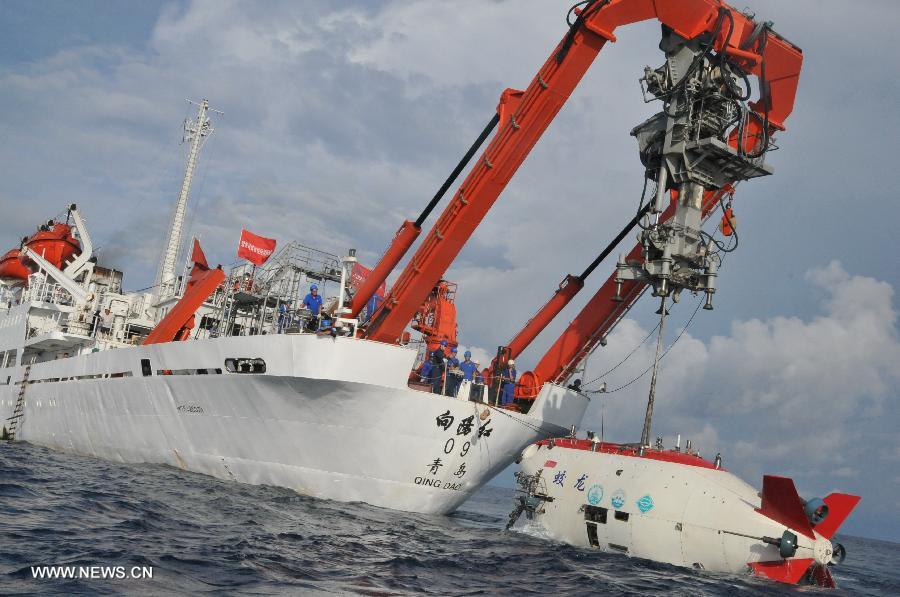 China's manned submersible Jiaolong is hoisted by its support ship Xiangyanghong 09 for a deep-sea dive into the south China sea, July 3, 2013. The Jiaolong manned submersible on Wednesday carried out a scientific dive to conduct geological sampling on a complex terrain. (Xinhua/Zhang Xudong)