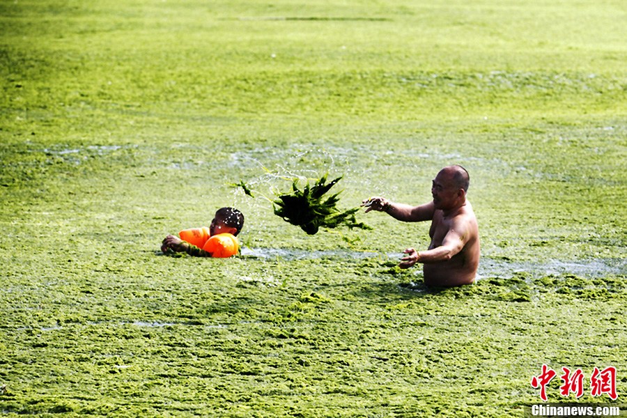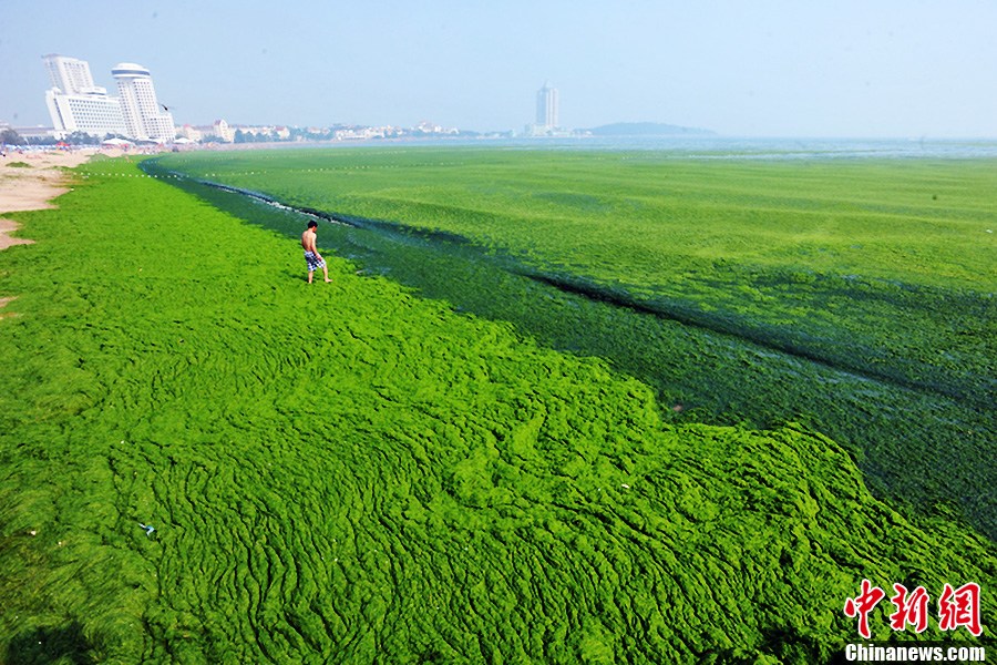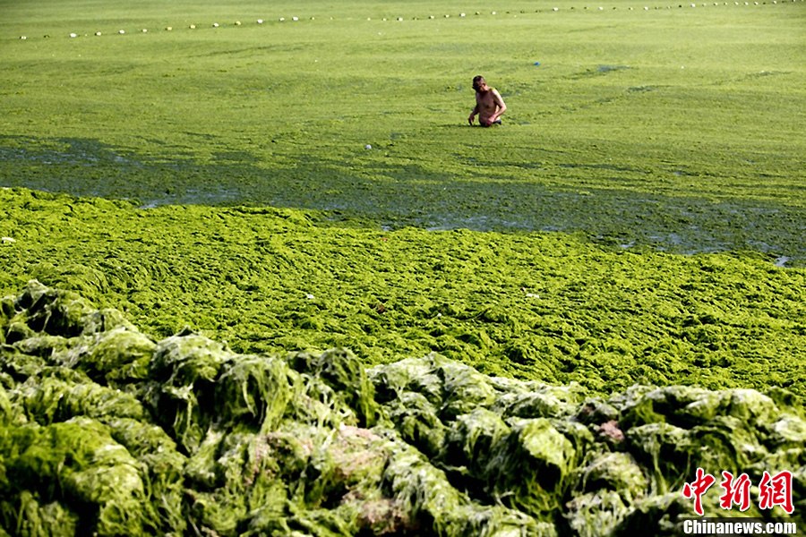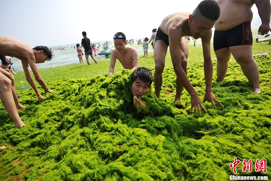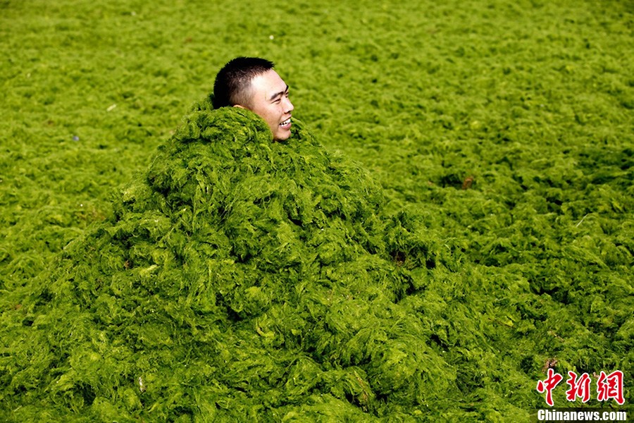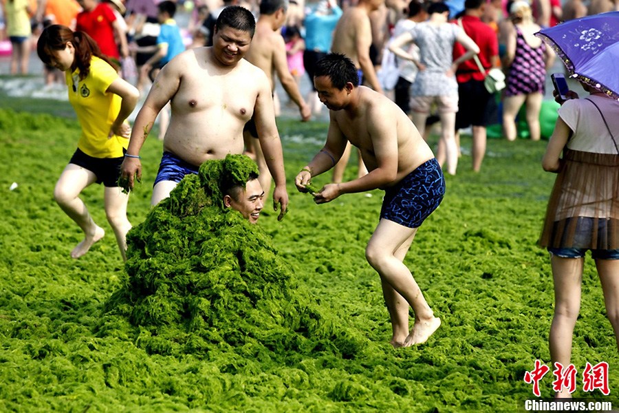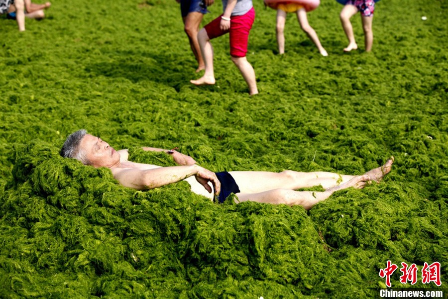 Photo taken on July 3 shows a man covers himself with green algae at beach in Qingdao City of East China's Shandong Province. The coastal city has been hit by the largest algae bloom this year. [Photo: IC / Xiao Mi]