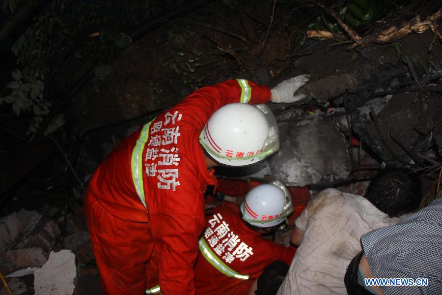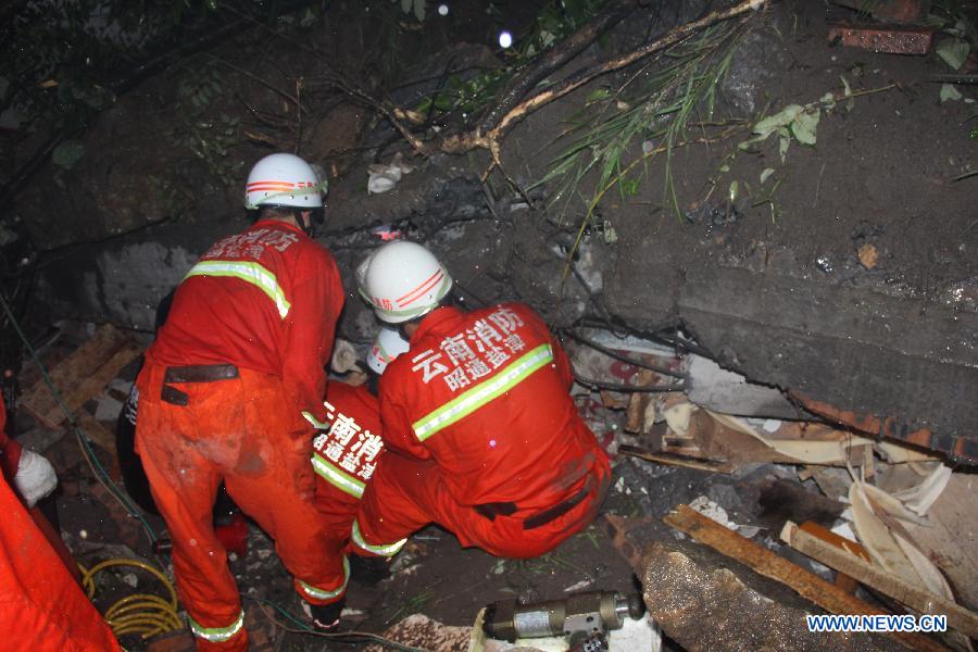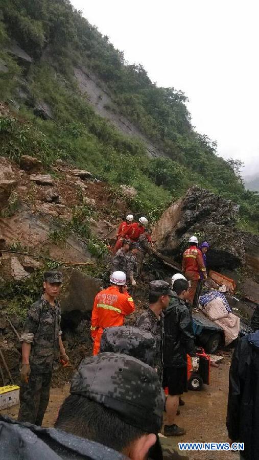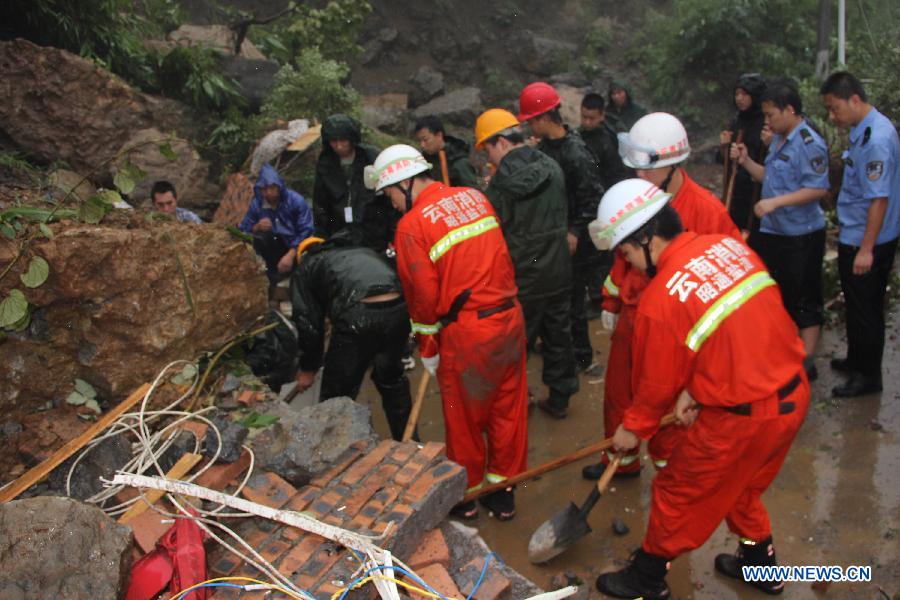 Rescuers search for survivors after a landslide in Gaoqiao Village of Yanjin County in Zhaotong City, southwest China's Yunnan Province, July 5, 2013. Nine people were buried by the landslide which happened on Friday morning. Four of them have been saved, while the other five are still missing. The rescue operation is underway. (Xinhua/Yuan Zhengxiong)