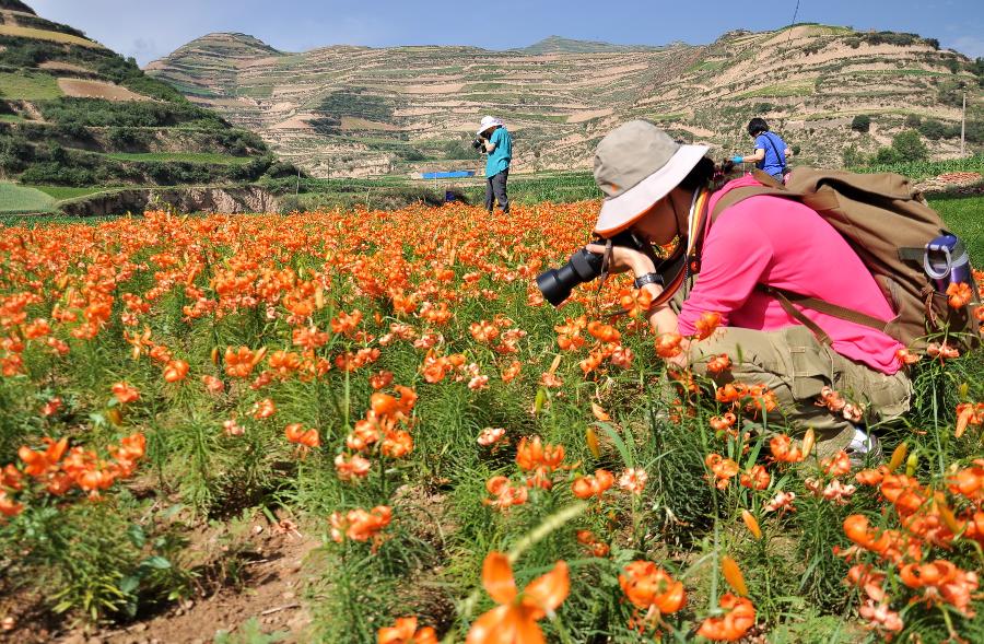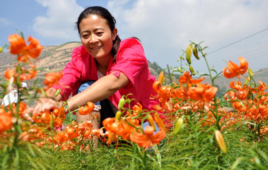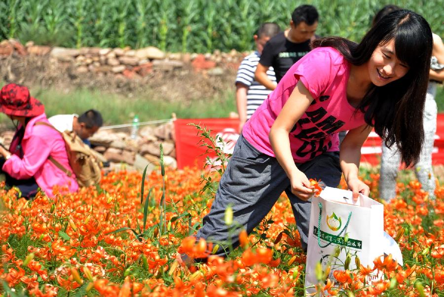 A visitor picks lily flowers during an activity of a cultural festival for lily flowers in Lanzhou, capital of northwest China's Gansu Province, July 5, 2013. (Xinhua/Guo Gang)