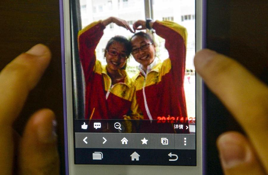 Photo taken on July 8, 2013 shows a picture of Wang Linjia (R) and Ye Mengyuan on a mobile phone, at Jiangshan Middle School in Jiangshan, east China's Zhejiang Province. Two Chinese passengers, Wang Linjia and Ye Mengyuan, were killed in a crash landing of an Asiana Airlines Boeing 777 at the San Francisco airport on Saturday morning. The two girls are both students of Jiangshan Middle School. Their family members headed for the United States on Monday.(Xinhua/Han Chuanhao)