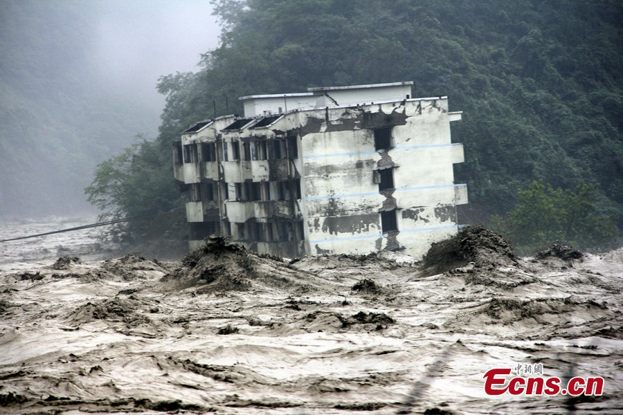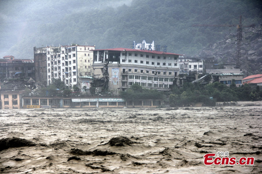 Torrential rain streams across the old Beichuan county seat in Southwest China's Sichuan Province, July 9, 2013. Rainstorm hit the quake zone from Monday afternoon to Tuesday morning, flooding many areas under protection, including the Cemetery Park and ruins of the former four-star Beichuan Hotel. [Photo: CNS/Yang Chao]
