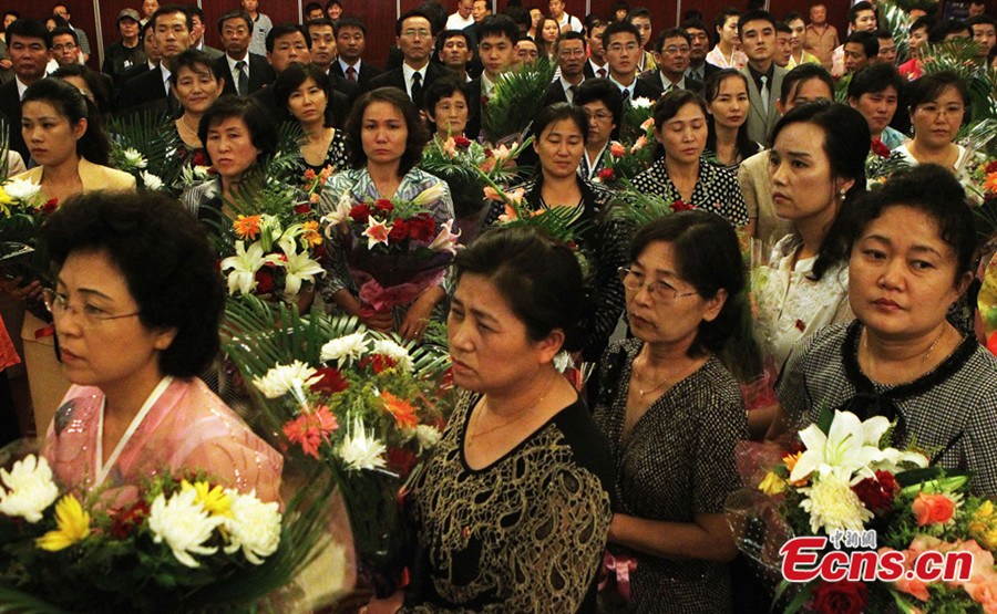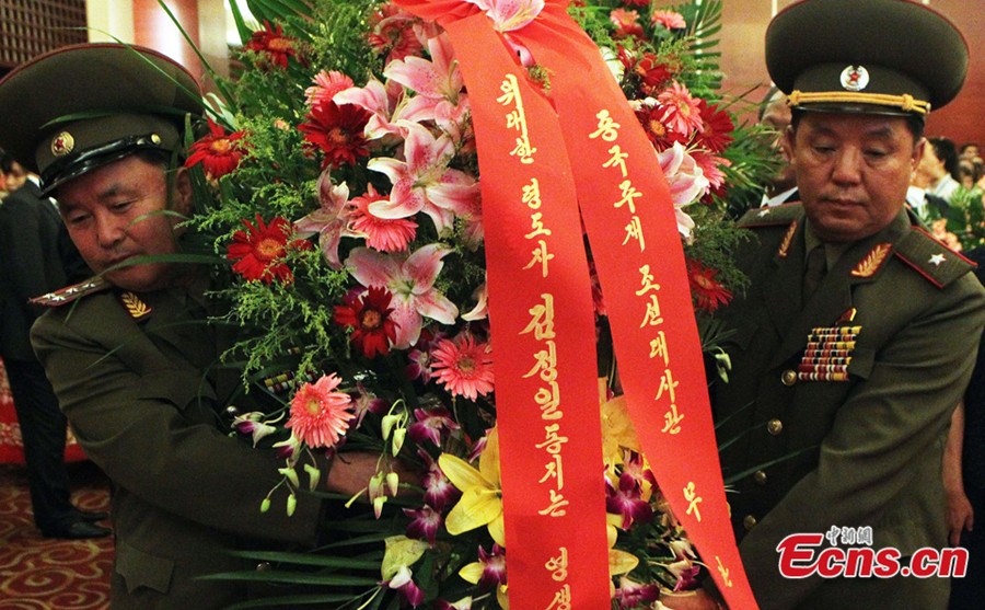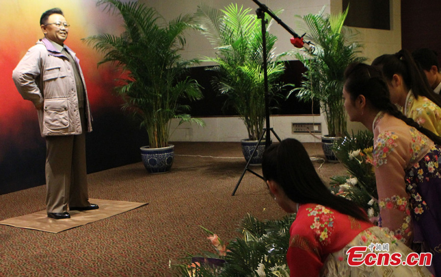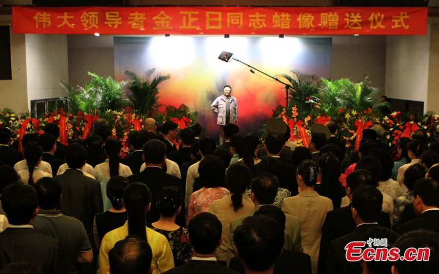 A wax statue of Kim Jong-il, late former leader of the Democratic People's Republic of Korea (DPRK), is given to the DPRK delegation during a ceremony in Beijing on July 9, 2013. The DPRK will unveil it on July 27, the 60th anniversary of the war against the United States. [Photo: CNS/Qian Xingqiang]