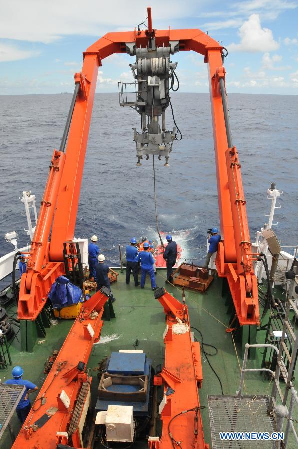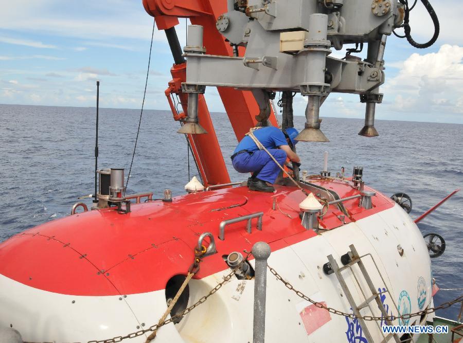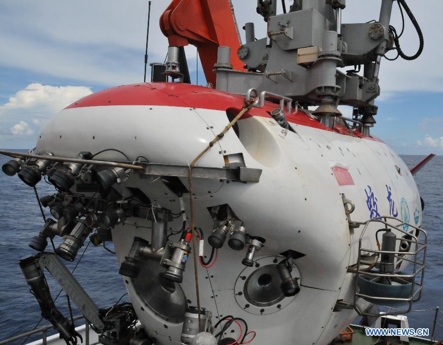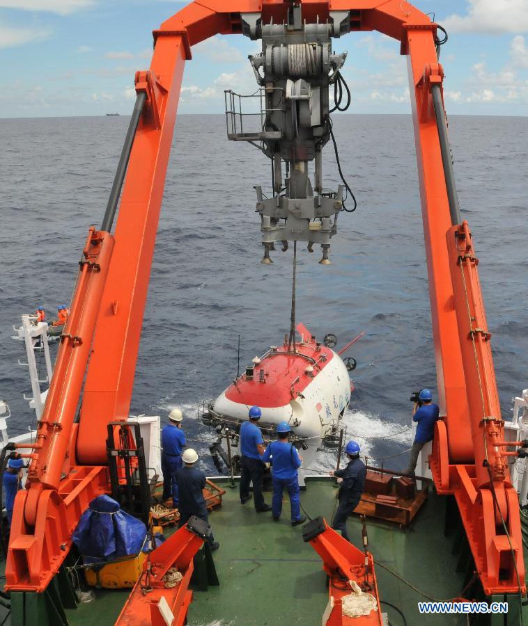 China's manned submersible Jiaolong dives into the South China Sea, south China, July 10, 2013. The Jiaolong manned submersible on Wednesday carried out the last scientific dive to explore the geology and environment of the sea area. (Xinhua/Zhang Xudong)
