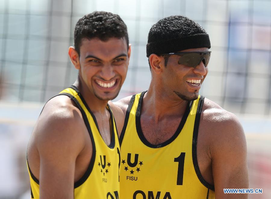 China's Wang Dafa (R) and Lin Minggui compete during the men's beach volleyball match against Al Belushi Hassan and Al Subhi Faisal of Oman at the 27th Summer Universiade in Kazan, Russia, July 9, 2013. Lin Minggui and Wang Dafa lost 0-2. (Xinhua/Meng Yongmin)
