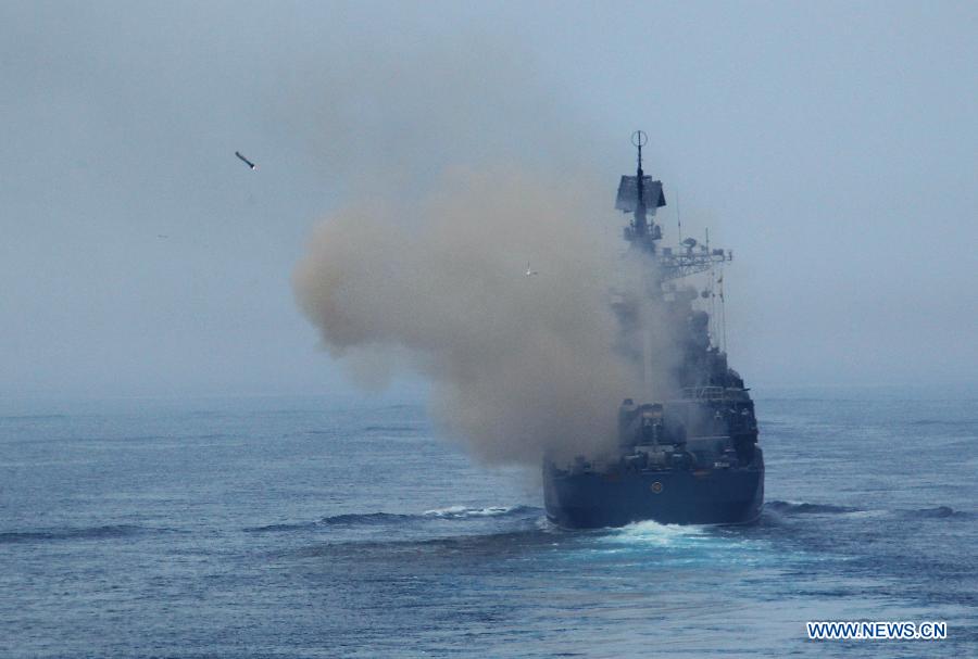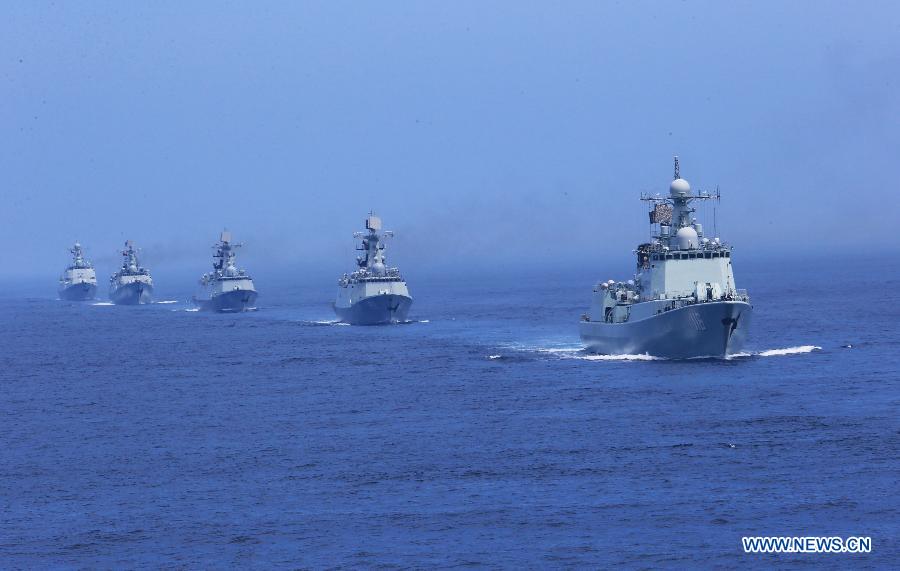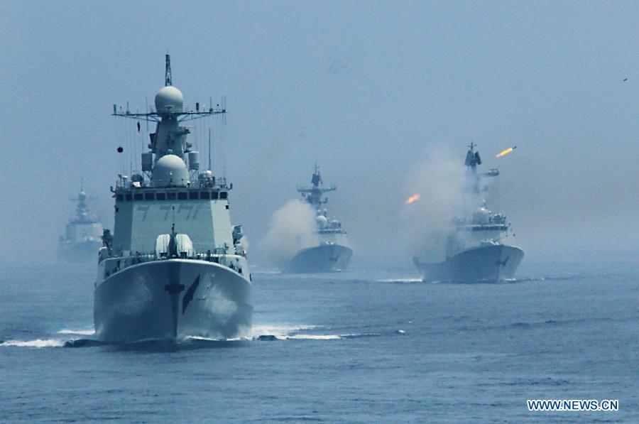 Chinese naval vessel fire anti-submarine missile during the "Joint Sea-2013" drill at Peter the Great Bay in Russia, July 10, 2013. The "Joint Sea-2013" drill participated by Chinese and Russian warships concluded here on Wednesday. (Xinhua/Zha Chunming)