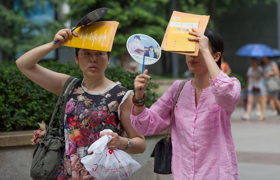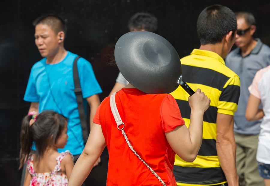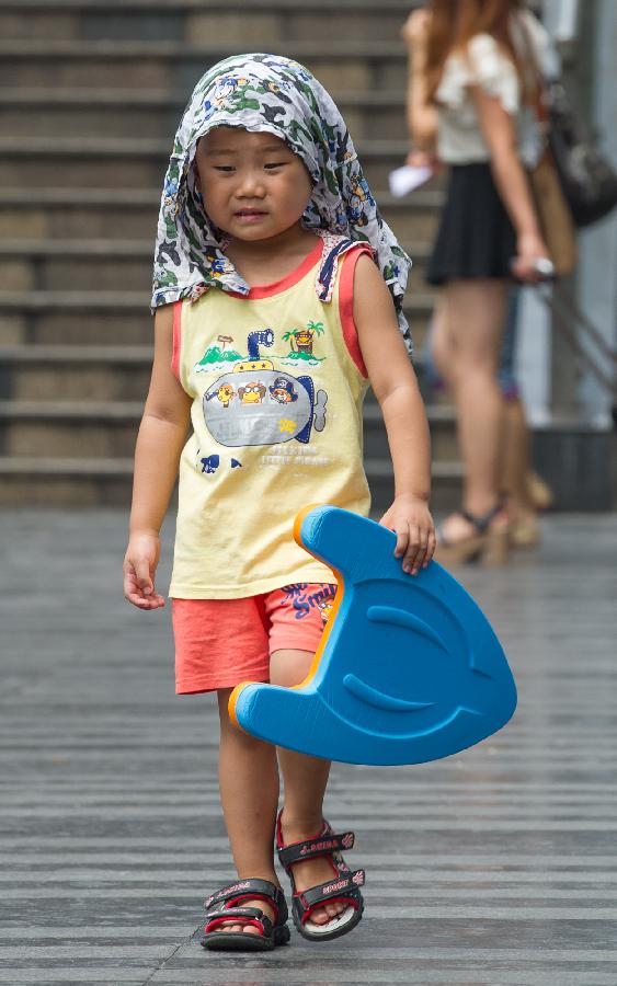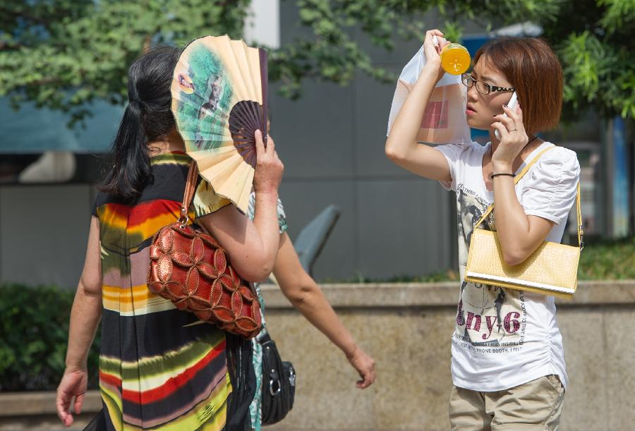 People walk on Guangyinqiao walking street during a heat wave in Chongqing, southwest China's municipality, July 11, 2013. Local meteorological observatory issued an orange-coded alert of heat on Thursday, as temperature in some parts of Chongqing has risen up to 37 degrees Celsius. (Xinhua/Chen Cheng)