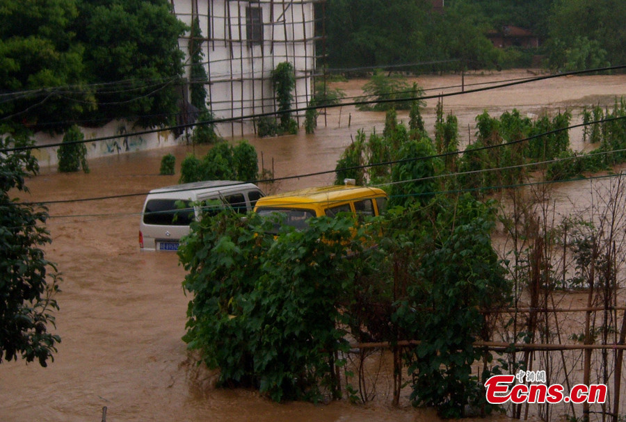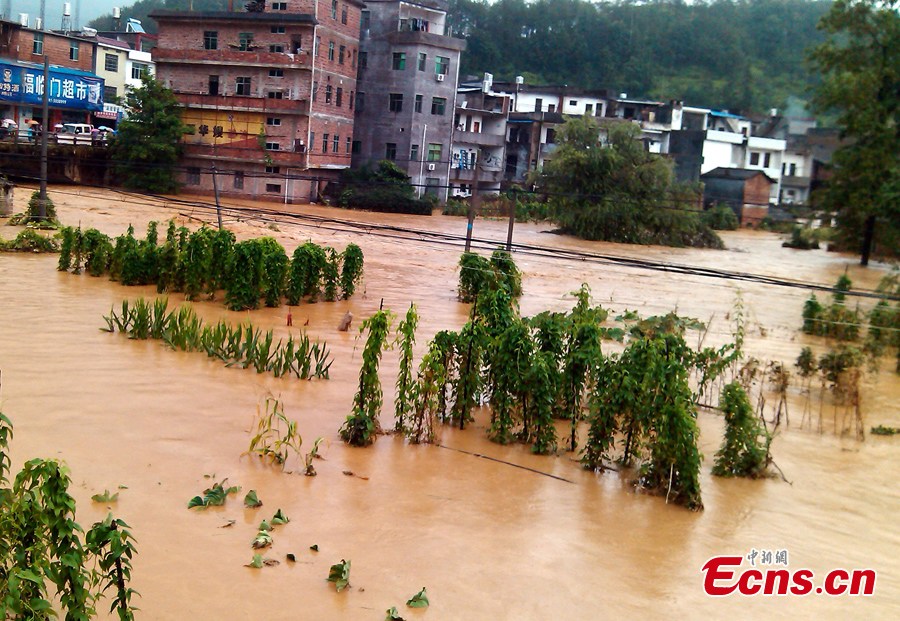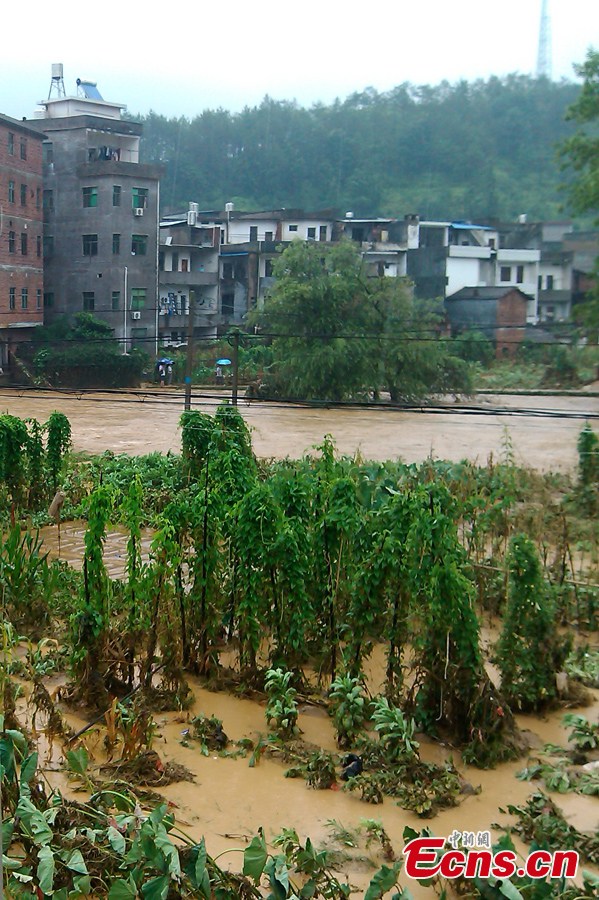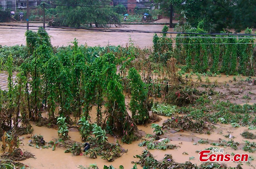 Photo taken on July 14, 2013 shows a waterlogged vegetable garden in Jun Village, Xingguo County, Ganzhou, Jiangxi Province. Typhoon Soulit-triggered rainstorms battered some parts of the province from Sunday morning, flooding many roads and farmlands. The seventh typhoon arrived in Jiangxi at 4 am on Sunday. [Photo: CNS/Zhong Mengqian]