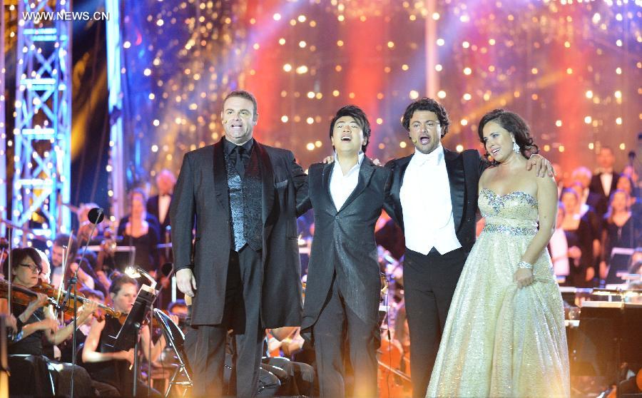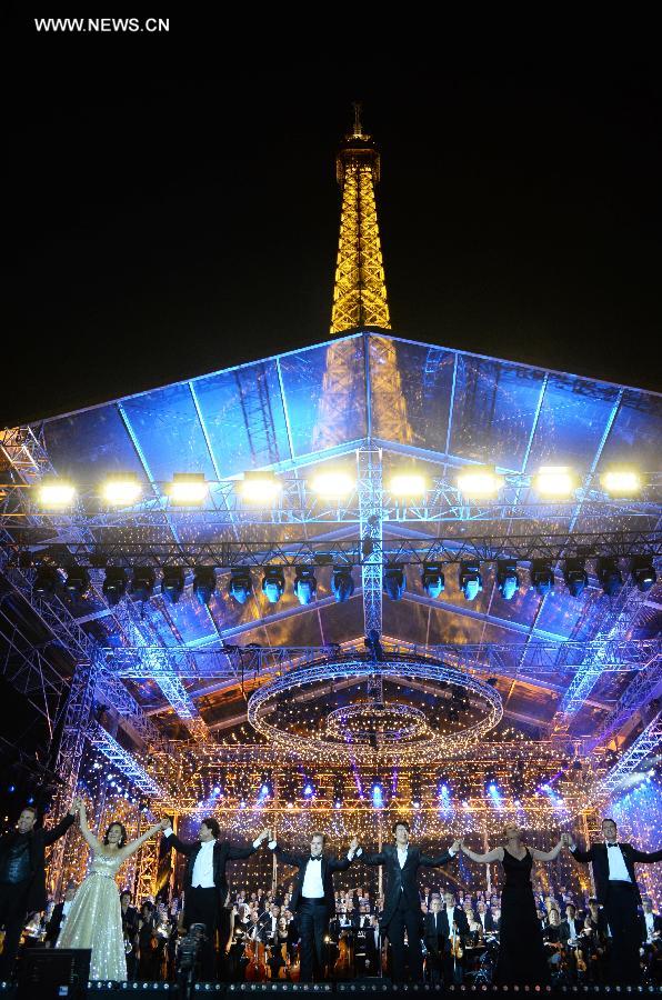 Chinese pianist Lang Lang greets the audience after playing piano during the national day concert held in Paris, France, on July 14, 2013. (Xinhua/Li Genxing)