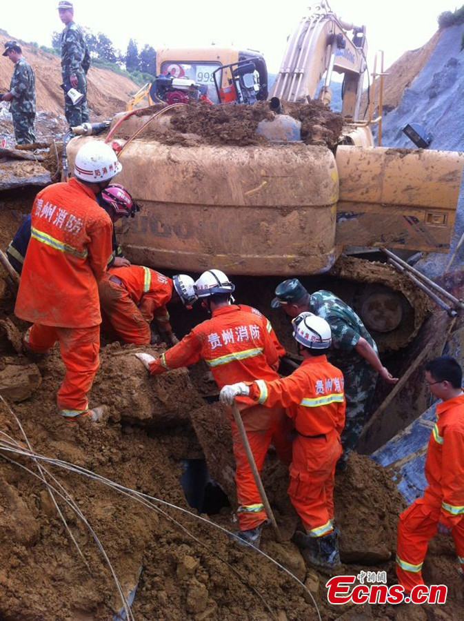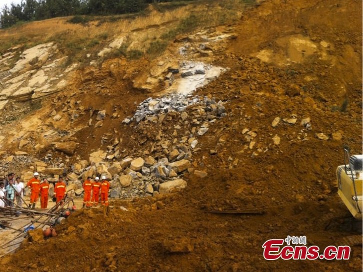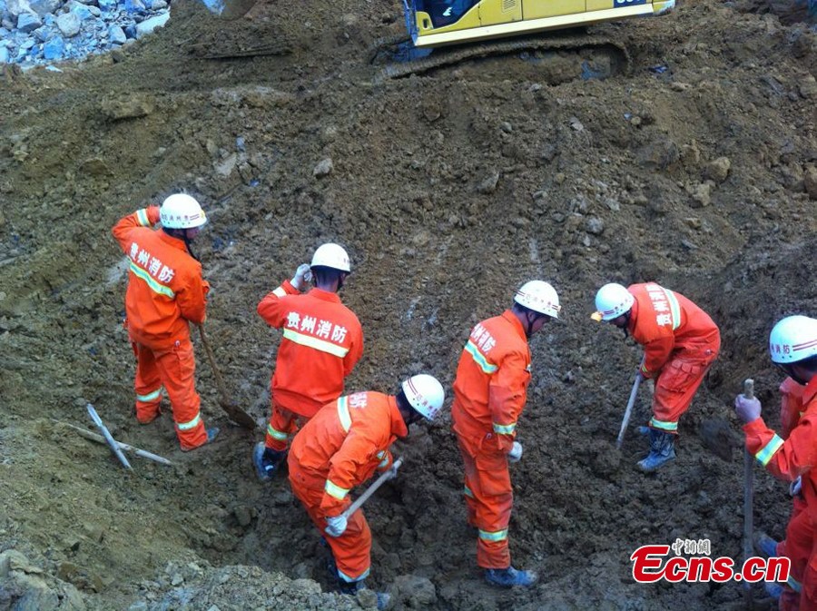 Rescuers work at the site of a landslide in Lishu Town, Bijie City, Southwest China's Guizhou Province, July 15, 2013. As of 4:30 p.m. on Monday, three people are confirmed dead, one is slightly injured and two others are missing. The landslide hit the town at around 3 p.m. [Photo: CNS/Zhong Xin]