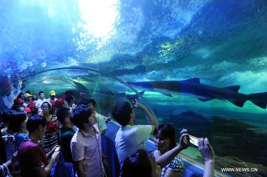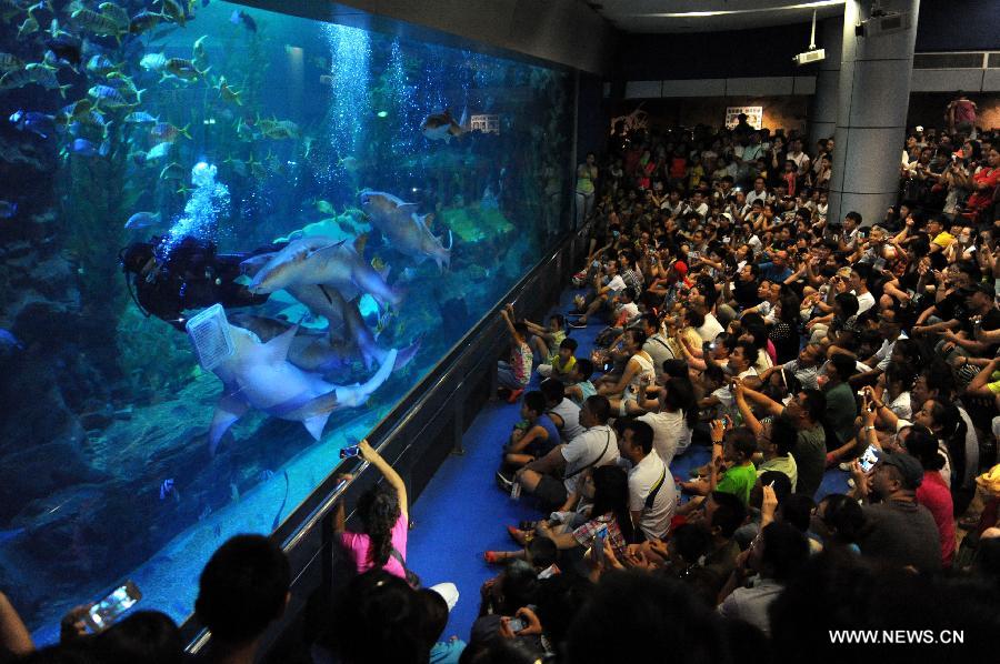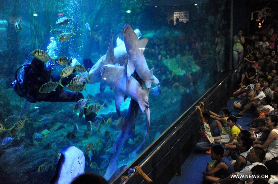 Tourists enjoy a "dancing with sharks" show at the Underwater World in Qingdao, east China's Shandong Province, July 15, 2013. (Xinhua/Li Ziheng)