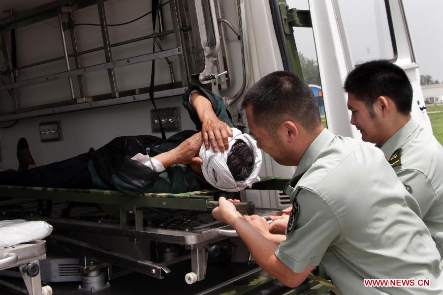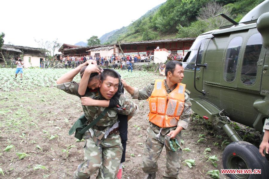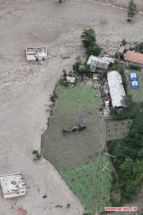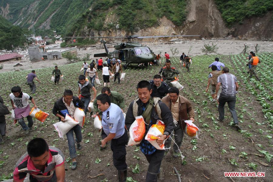 Local residents help relief workers unload disaster-relief supplies from a helicopter in Caopo Township of Wenchuan County, southwest China's Sichuan Province, July 16, 2013. The People's Liberation Army (PLA) Chengdu Military Area Command has dispatched helicopters to help with relief work in Wenchuan County which has been affected by flooding. An aviation unit dispatched three helicopters with 19 relief workers and 7.5 tonnes of materials in 12 flights to Caopo Township of Wenchuan County, which suffered downpours and mud-rock flows, according to the area command. (Xinhua/Wu Tailiang)
