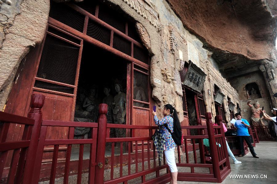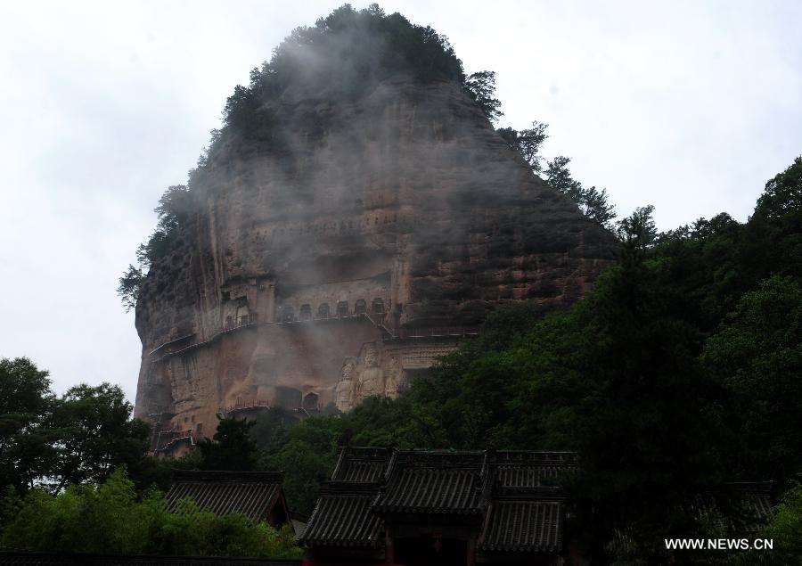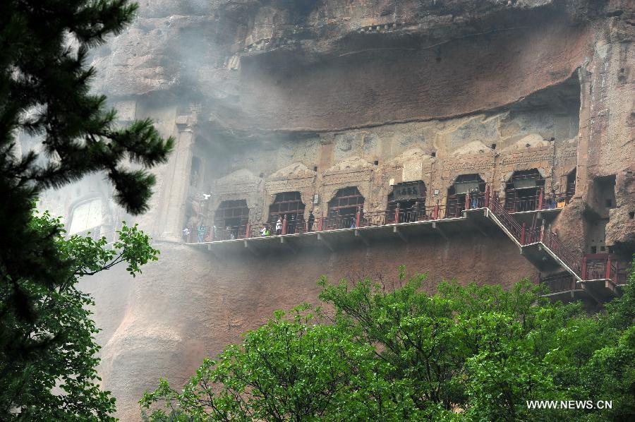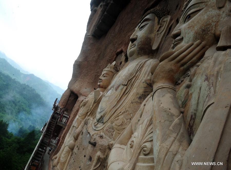 Photo taken on July 15, 2013 shows sculptures on the cliff of the Maiji Mountain Grottoes in Tianshui, northwest China's Gansu Province. After protection and preparation, the Maiji Mountain Grottoes, the fourth largest grottoes in China and known as the "Oriental Sculpture Museum", has been ready for the application for status on the World Heritage List in 2014, as a part of the application program of the 2,000-year-old Silk Road which China works with Kazakstan and Kyrgyzstan and was officially submitted to the United Nations Educational, Scientific and Cultural Organization (UNESCO) in January of 2013. China has altogether 22 historical sites in this application program, including seven in Xinjiang, five in Gansu, six in Shaanxi and four in Henan. (Xinhua/Nie Jianjiang)