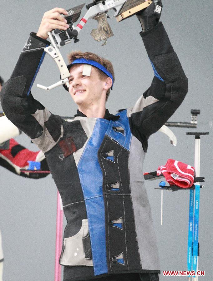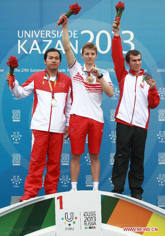 Gold medalist Nazar Luginets(C) of Russia, Silver medalist China's Kang Hongwei(L) and Bronze medalist Poland's Tomasz Bartnik pose for photo during the awarding ceremony of Men's 50m Rifle 3 Positions final at the 27th Summer Universiade in Kazan, Russia, July 17, 2013. Luginets won the gold medal with 457.5 rings. (Xinhua/Ren Yuan)