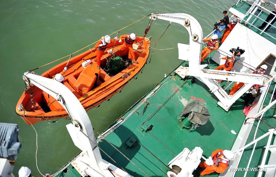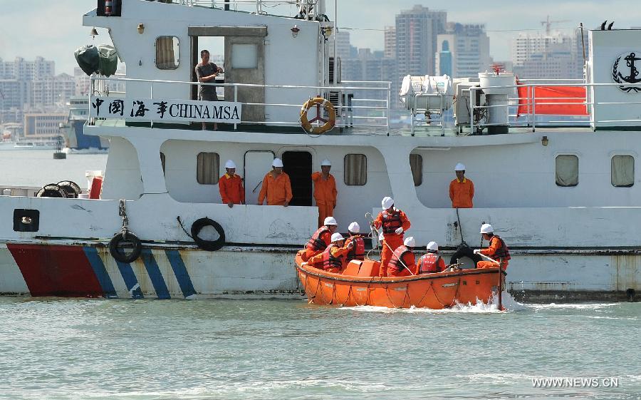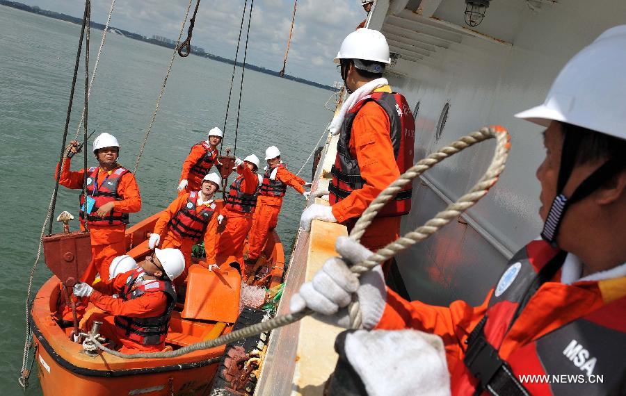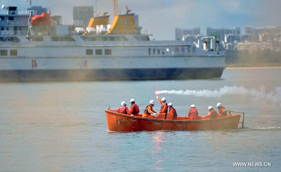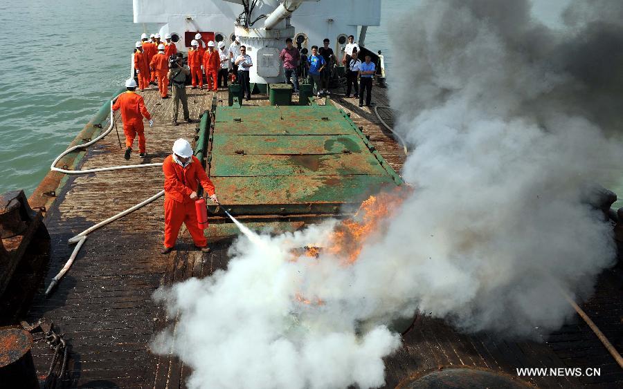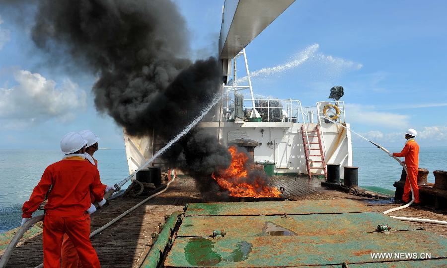 Seamen participate in a maritime fire drill held by the South China Sea Navigation Support Center at the Qiongzhou Strait near Haikou, capital of south China's Hainan Province, July 18, 2013. (Xinhua/Guo Cheng)