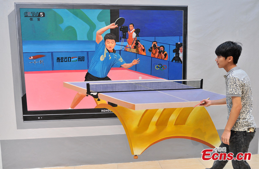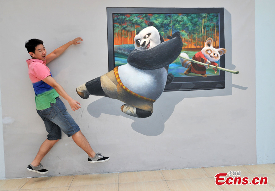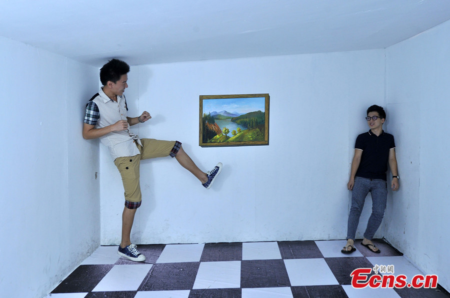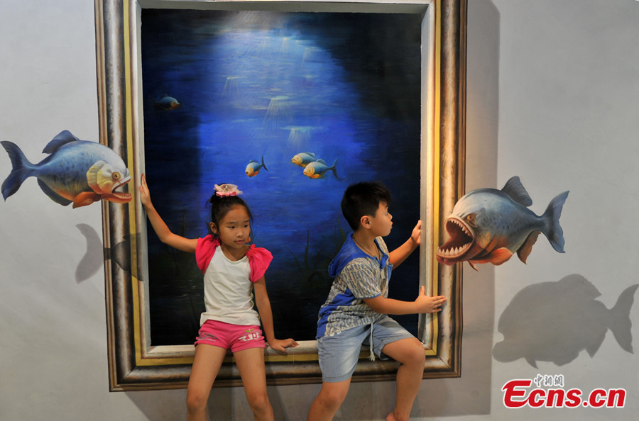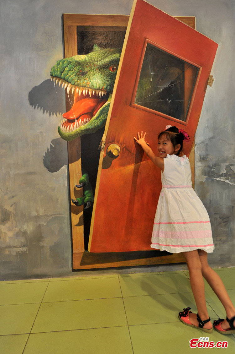Photo taken on July 18 shows a visitor has fun at a 3D art exhibition in Fuzhou of Fujian Province. More than 40 3D magic paintings are shown to the public at the exhibition. [Photo: CNS / Lv Ming]