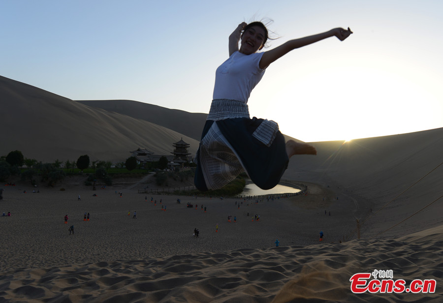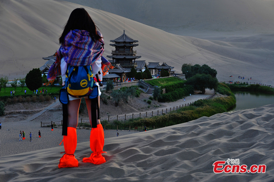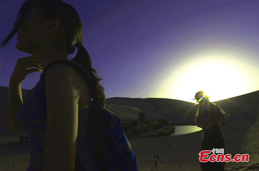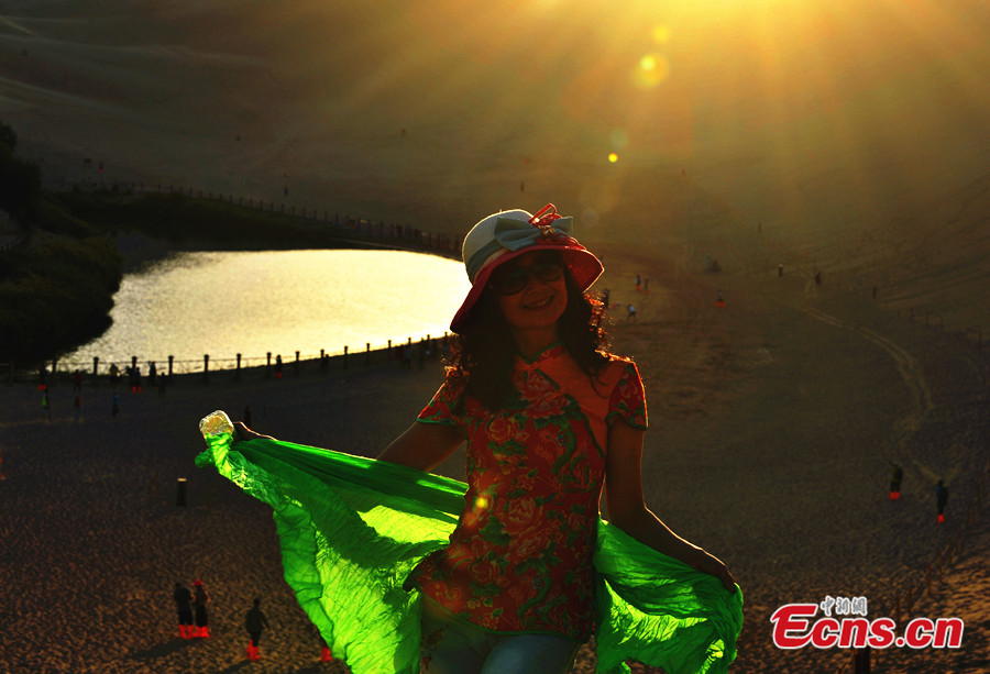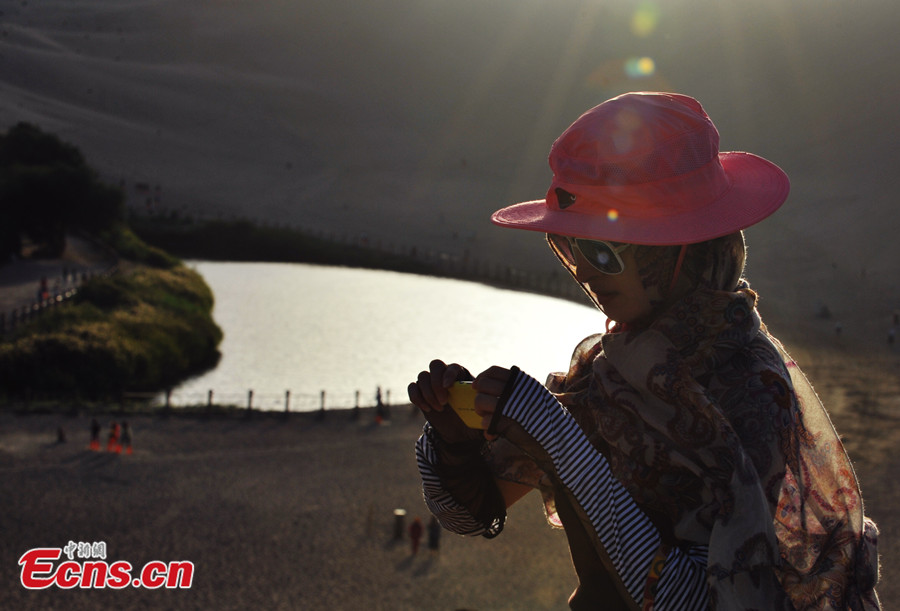 A visitor looks through photos of sunset in her camera at the scenic spot of Crescent Lake in Dunhuang City of Northwest China's Gansu Province. [Photo: CNS / Jia Guorong]