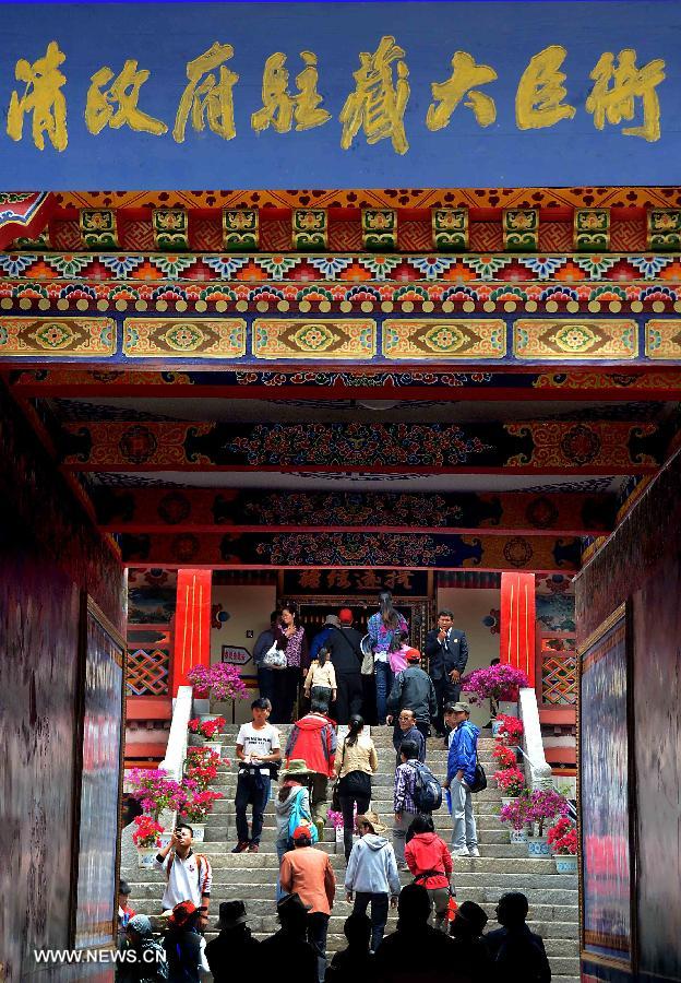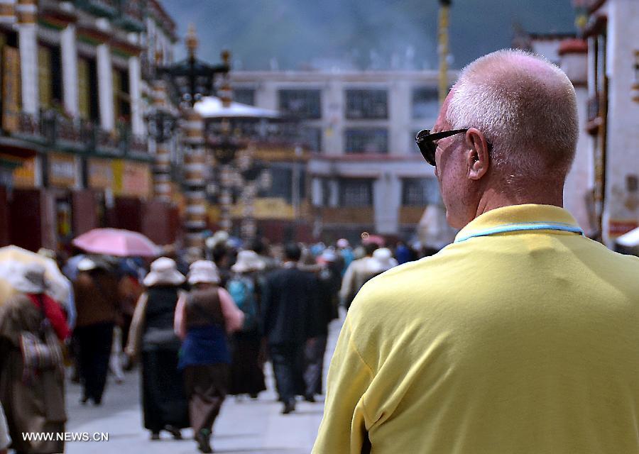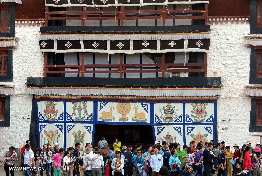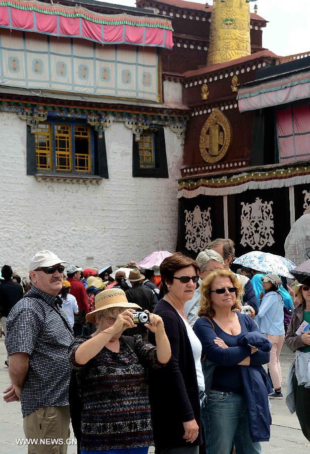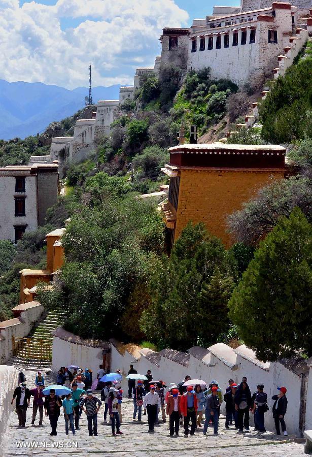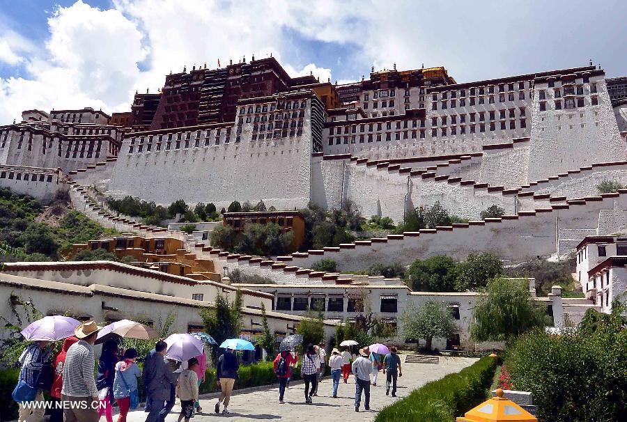 Tourists visit the Potala Palace in Lhasa, capital of southwest China's Tibet Autonomous Region, July 18, 2013. Over 4,000 tourists visit Tibet everyday as Tibet entered the peak tourist season since late June. (Xinhua/Wang Song)