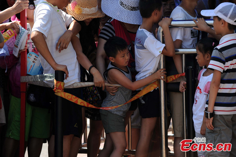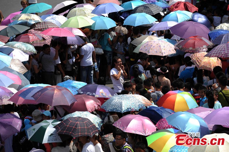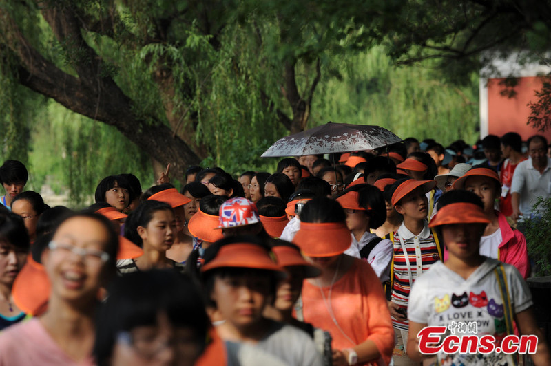 A large number of people wait at the east gate of Peking University to visit the campus on July 17, 2013. An iron pillar holding plastic sunshade is bent by the crowds. [Photo: IC]