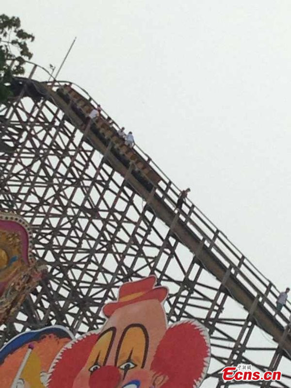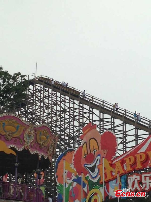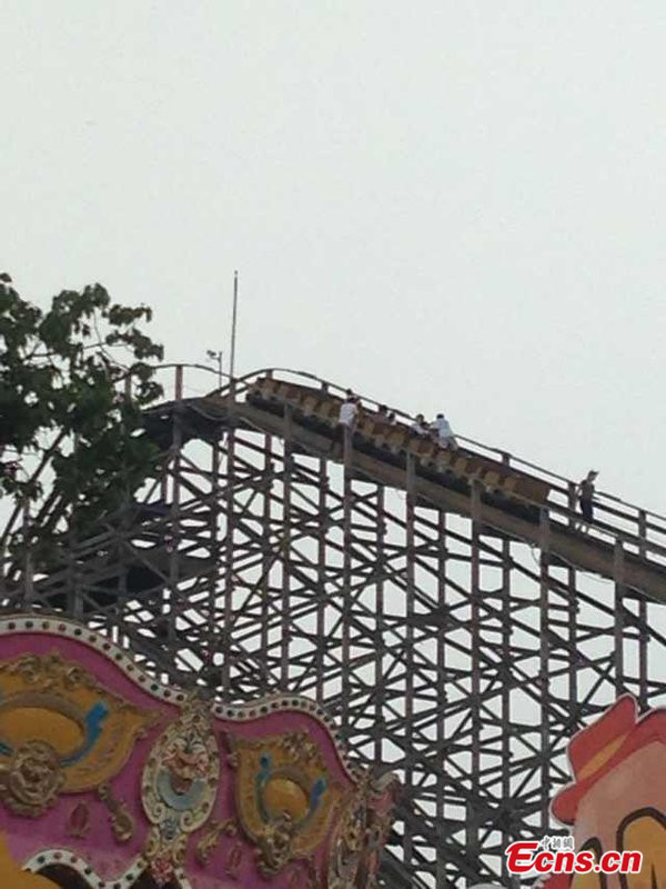All 24 people who got stuck for about three minutes were evacuated safely, park officials said. No injuries were reported but riders were said to have been freaked out by the incident. The 1,164-meter-long wooden roller coaster, named Fireball, peaks at 33 meters. It was China's first wooden roller coaster. [Photo/CFP]