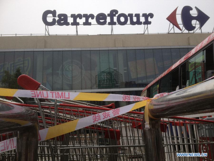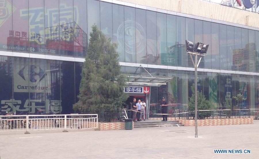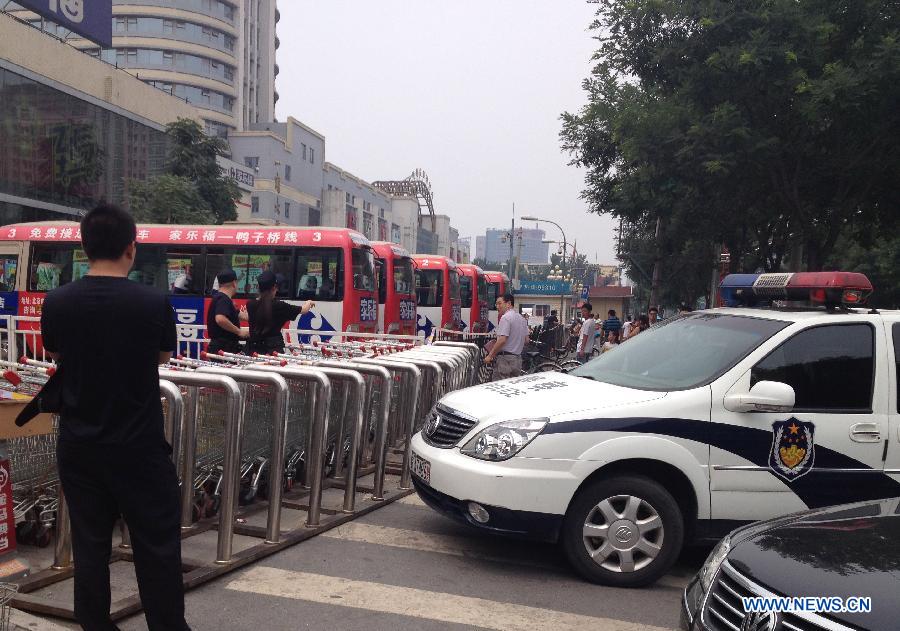A Carrefour store is cordoned off after a knife attack occurred in Beijing, capital of China, July 22, 2013. A knife-wielding man allegedly injured four people, including two children, on Monday in the Carrefour store. (Xinhua/Jin Liwang)