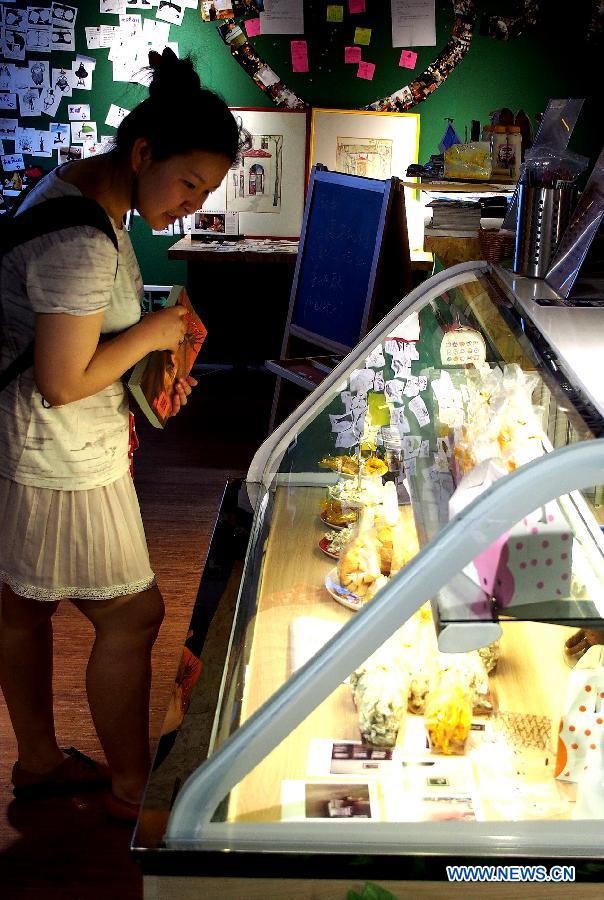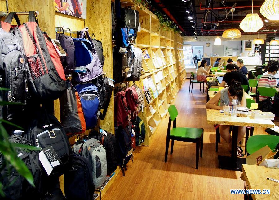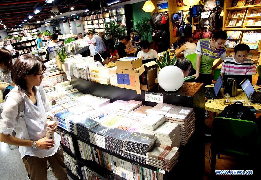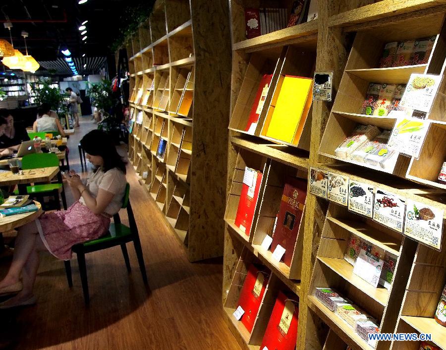 Photo taken on July 21, 2013 shows a bookstore on Huaihai Road in east China's Shanghai. Some new style bookstores in Shanghai are opened with beverage, food supply and stationery selling. These customer-oriented bookstores bring a new idea for selling books and attract many customers to spend time on reading here. (Xinhua/Chen Fei)