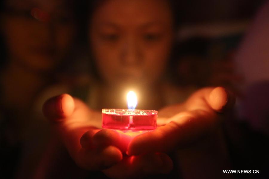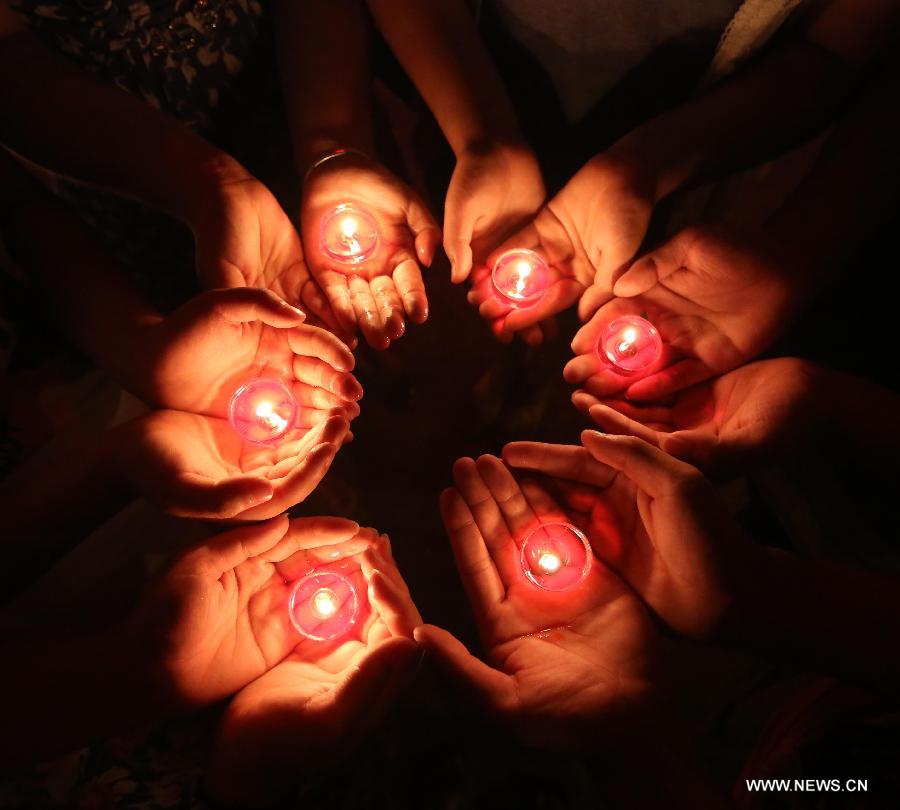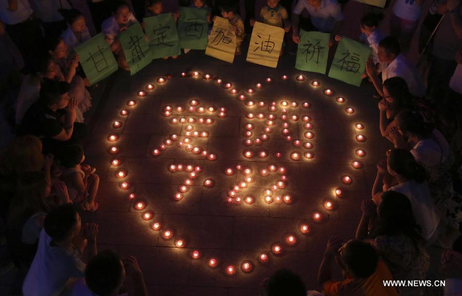 Volunteers hold candles as they pray for the residents and victims of quake-hit Dingxi City in northwest China's Gansu Province, in Loudi City, central China's Hunan Province, July 22, 2013. A 6.6-magnitude earthquake jolted a juncture region of Minxian County and Zhangxian County in Dingxi City Monday morning, leaving 89 people dead. (Xinhua/Guo Guoquan)