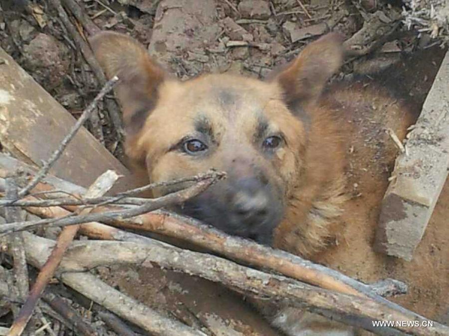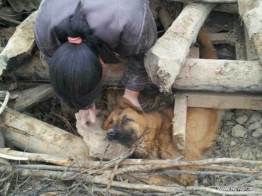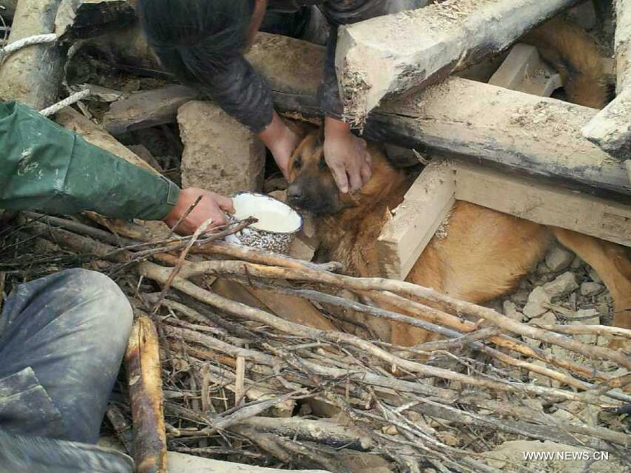 This photo taken by mobile phone shows a rescuer treating an wounded dog trapped in ruins in the quake-hit Lalu Village, Hetuo Township, Dingxi, northwest China's Gansu Province, July 25, 2013. The dog that survived by drinking rainwater was buried in a collapsed house for 77 hours before rescuers found it on Thursday. (Xinhua/Gao Bingnan)