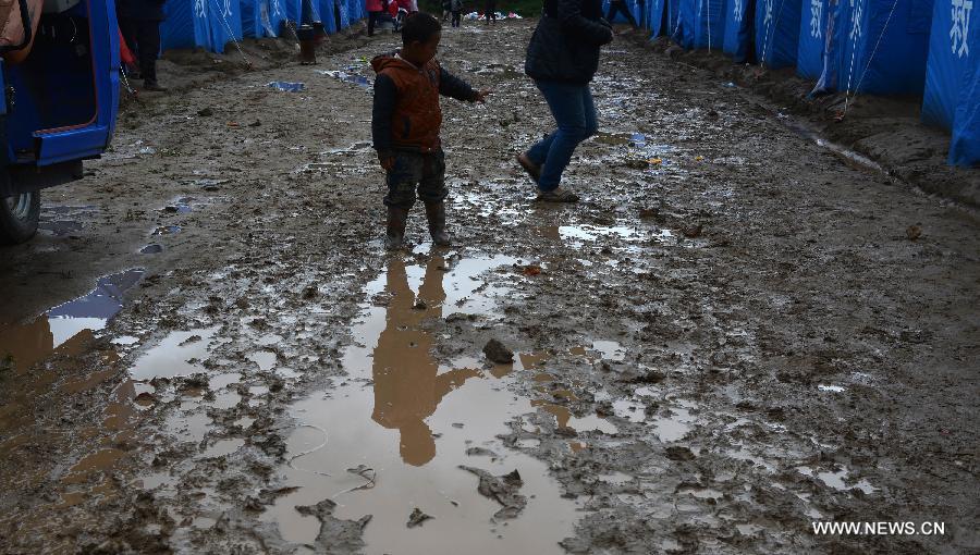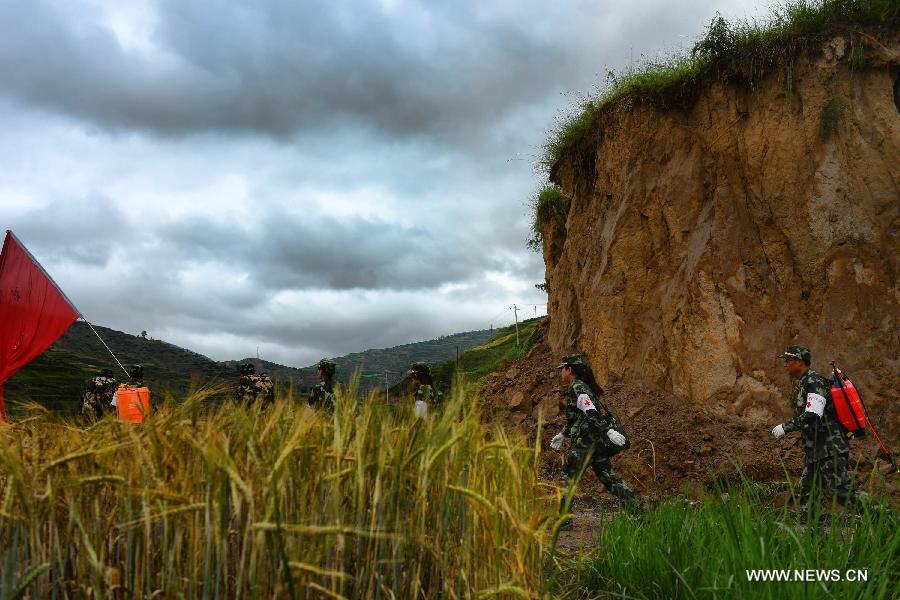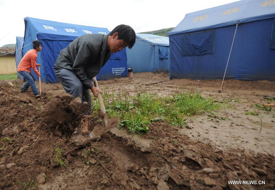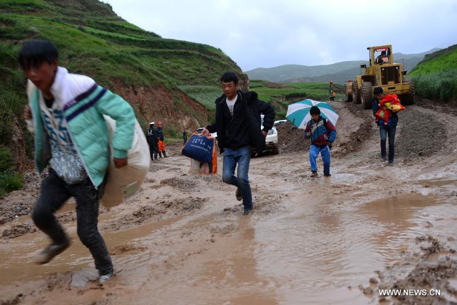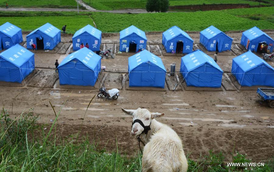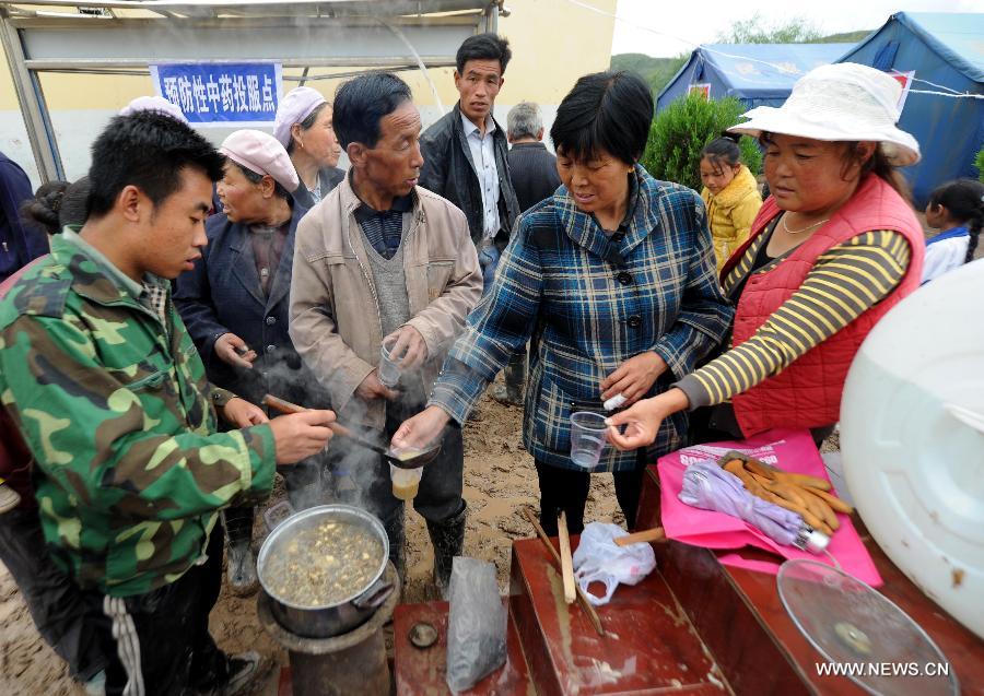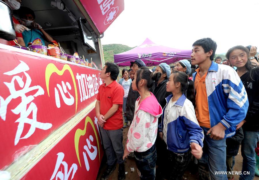 A company offers instant noodles to villagers in a makeshift settlement area in Majiagou Village of Meichuan Township, in quake-hit Minxian County, northwest China's Gansu Province, July 25, 2013. Precautions have been taken to prevent second disasters since a torrential rainfall started on Wednesday in the quake-stricken area. (Xinhua/Luo Xiaoguang)