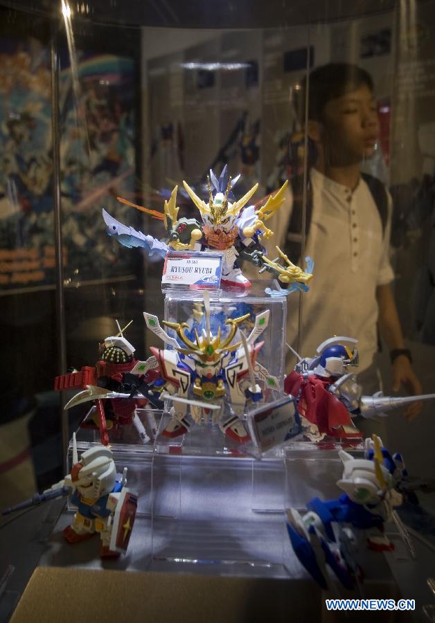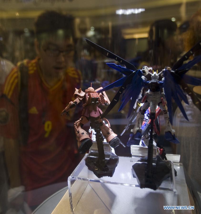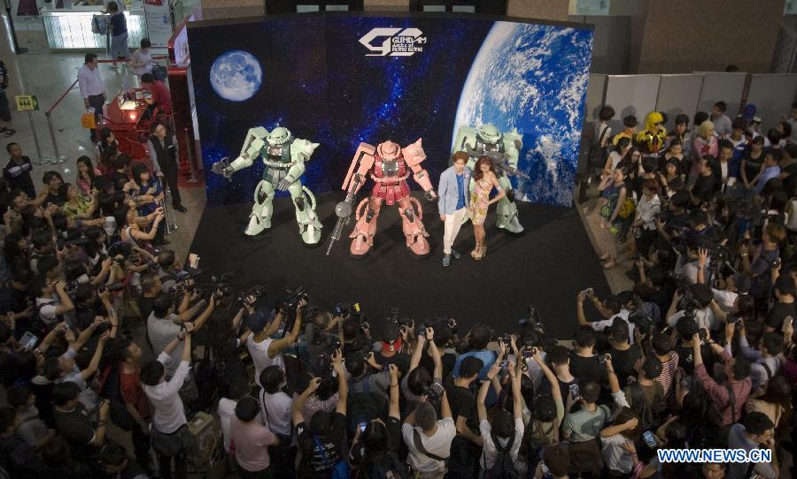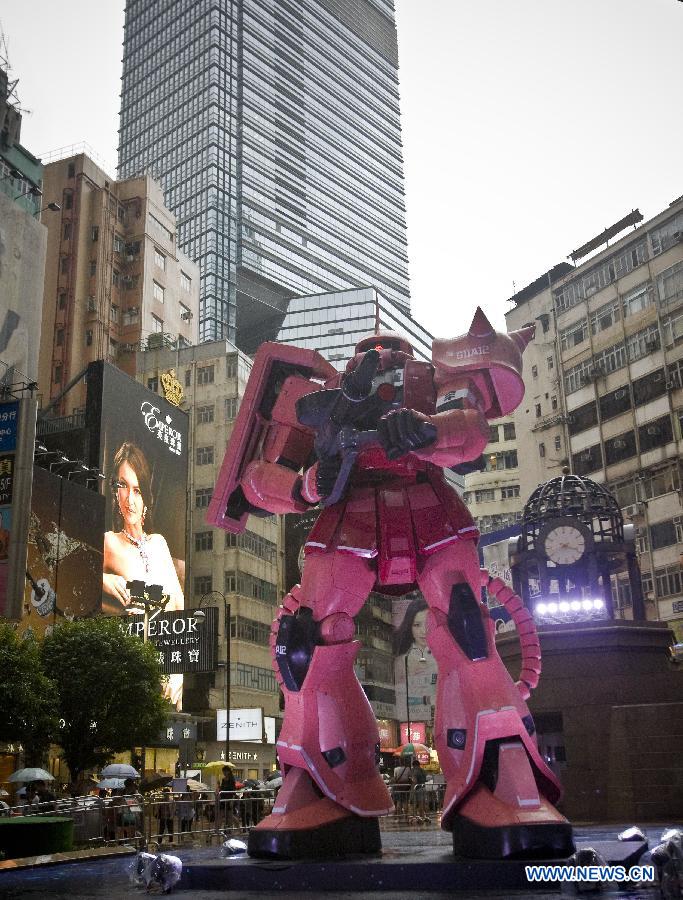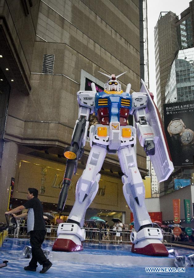 A six-meter-tall model of a "Gundam" robot in Japan's TV animation "is set up in Hong Kong, south China, July 25, 2013. The exhibition "Gundam Docks at Hong Kong" held its opening event here on Thursday, showcasing some 100 "Gundam" models. (Xinhua/He Jingjia)