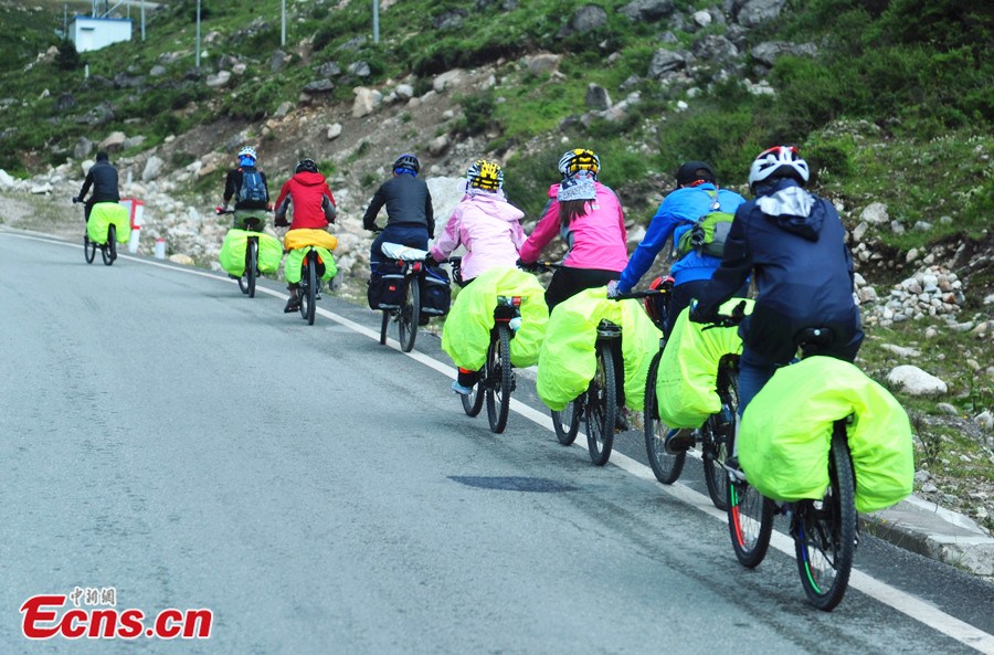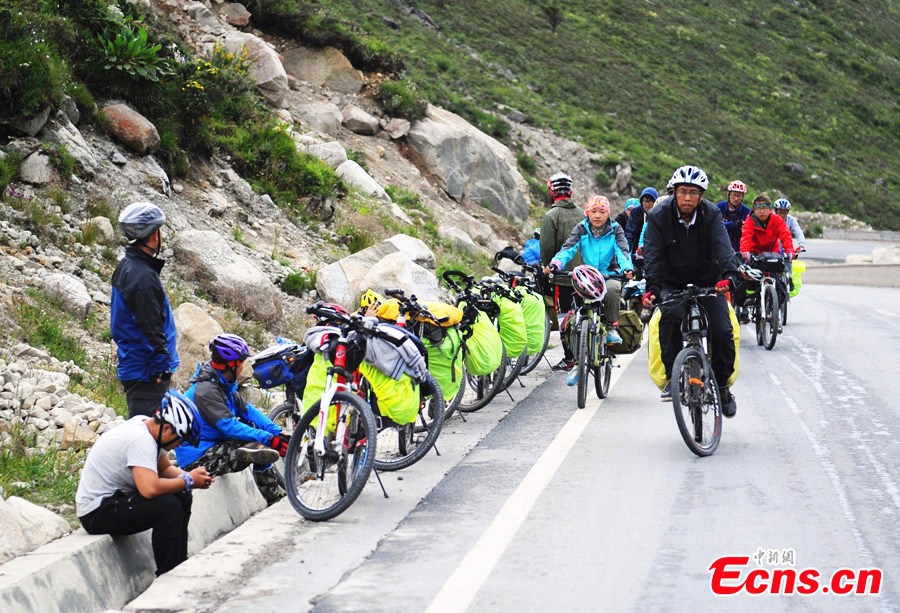 Photo taken on July 25 shows bicycle riders at the Sichuan-Tibet Highway, a section of China National Highway 318 (G318). Sichuan-Tibet Highway begins in Chengdu of Sichuan on the east and ends at Lhasa in Tibet on the west. [Photo: CNS / Liu Zhongjun]