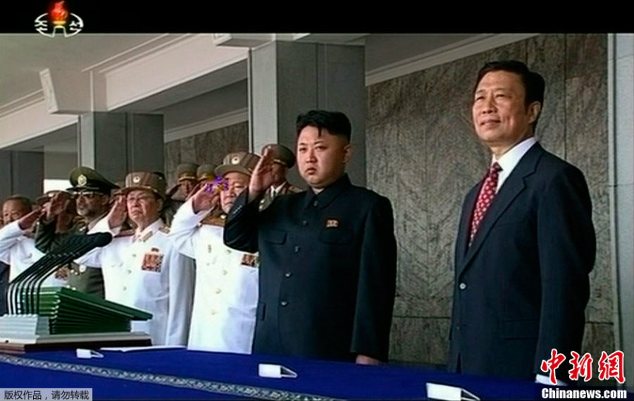 Visiting Chinese Vice President Li Yuanchao (R) and Kim Jong Un, top leader of the Democratic People's Republic of Korea (DPRK) (L), are in a military parade held by the DPRK marking the 60th anniversary of the signing of the Korean War Armistice Agreement at Kim Il Sung Square in Pyongyang on July 27, 2013. [Photo: CNS]