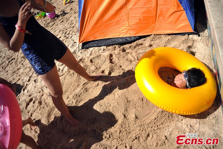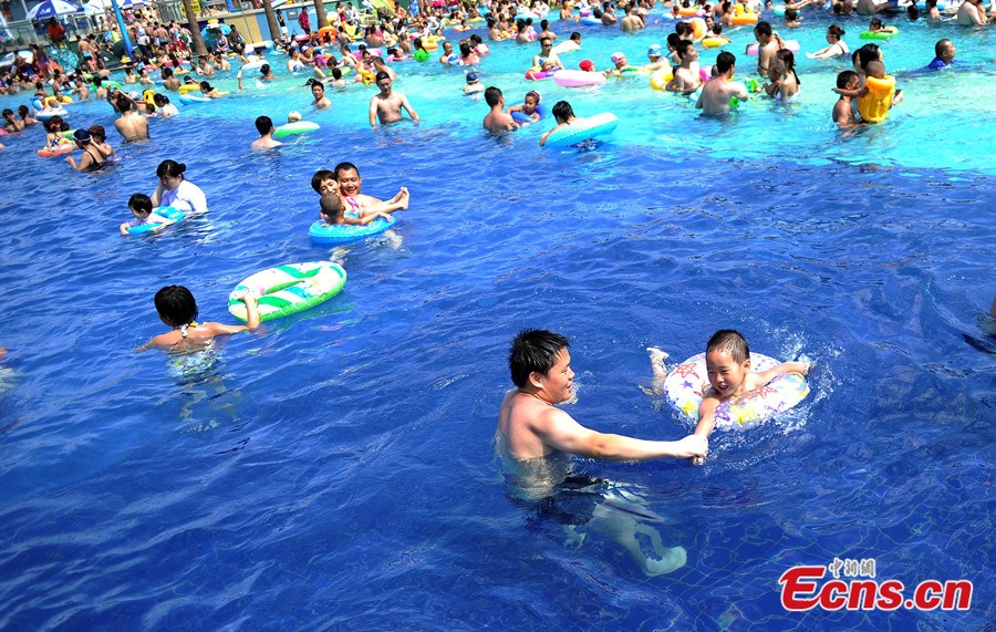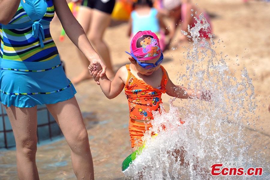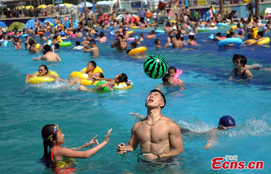 Photo taken on July 28 shows tourists at a beach festival in Chaoyang Park of Beijing. A heat wave hit many parts of the country these days and the capital city also issued the second orange-coded heat alert of this summer on Sunday. [Photo: CNS / Jin Shuo]