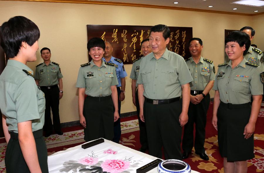 Chinese President Xi Jinping (C), also general secretary of the Central Committee of the Communist Party of China (CPC) and chairman of the Central Military Commission (CMC), shakes hands with military cadre during his tour of the Beijing Military Area Command in Beijing, capital of China, July 29, 2013. Xi made this visit ahead of the Army Day, which falls on Aug. 1 and marks the 86th anniversary of the founding of the People's Liberation Army (PLA). (Xinhua/Li Gang)