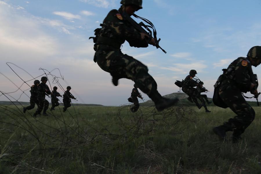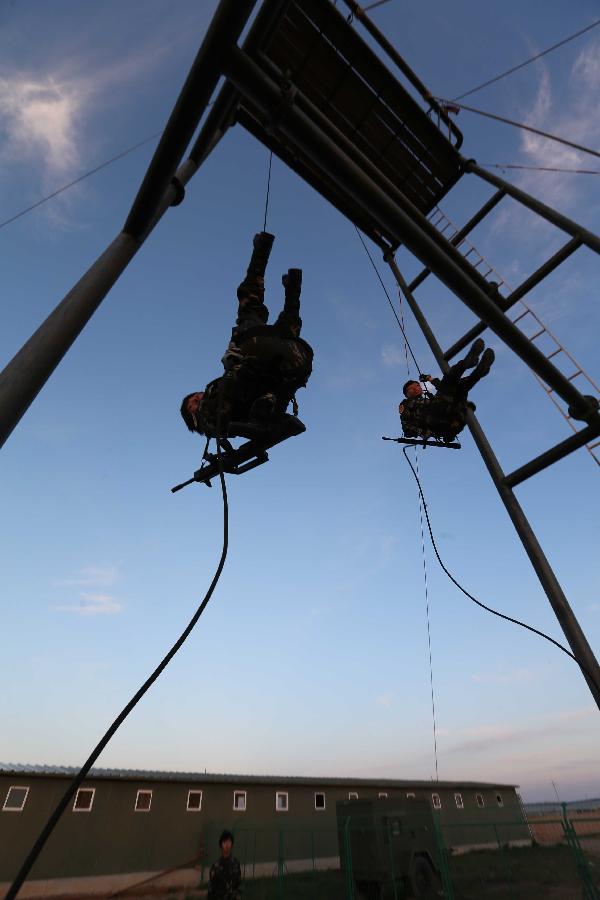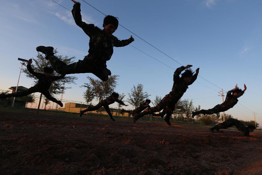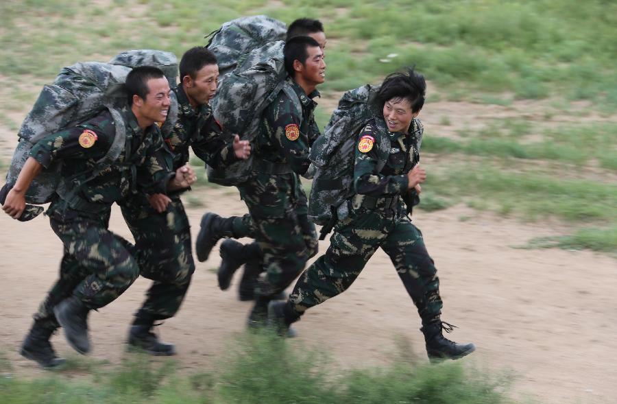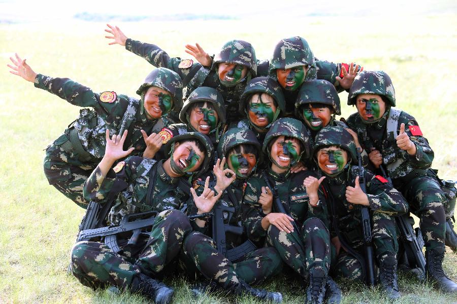 Female soldiers pose for photo during a training break at the Zhurihe training base in north China's Inner Mongolia Autonomous Region, July 17, 2013. The first female special forces unit established by the Chinese People's Liberation Army received intensive training as the Army Day is coming. The youngest soldier of the unit is 18 years old while the oldest one is 26. All of the female soldiers have college degrees or above and have been trained to master special combat skills. (Xinhua/Wang Jianmin)