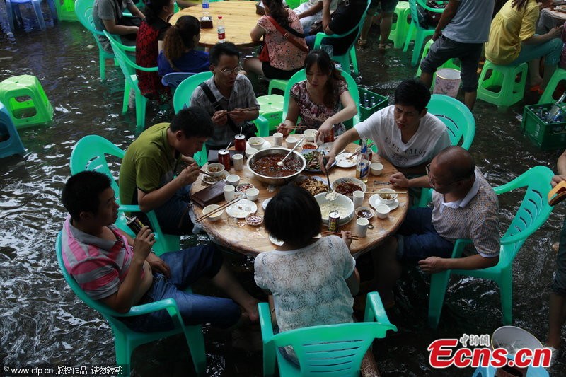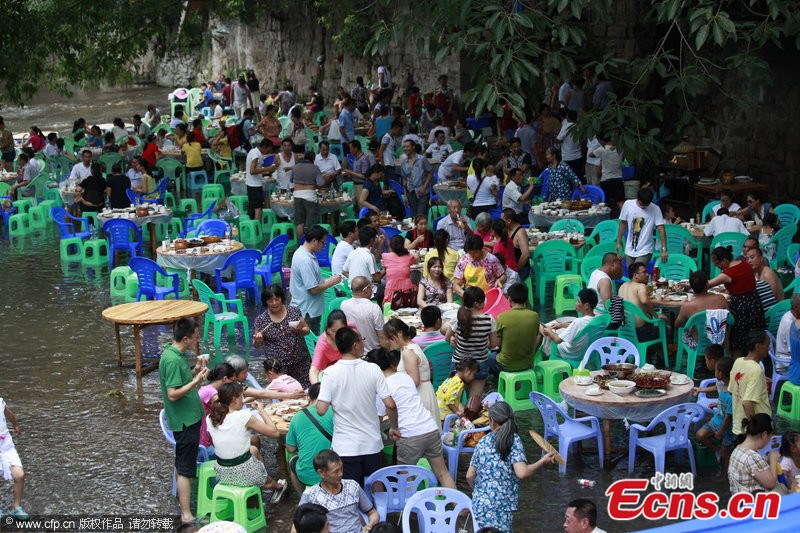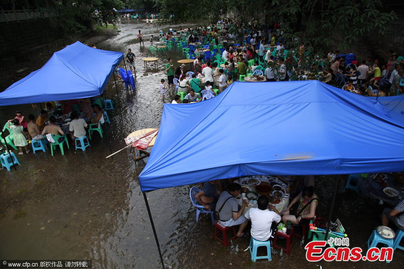 Photo taken on July 28 shows residents and tourists have dinner with feet soaked in the river at Pianyan Ancient Town of Beibei, Chongqing Municipality. [Photo/ CFP]