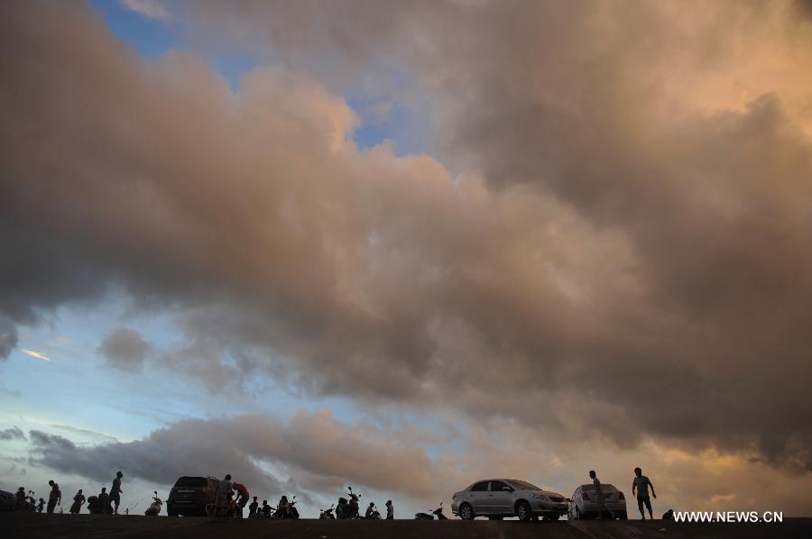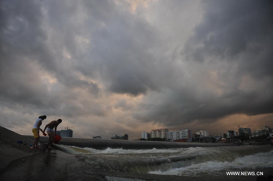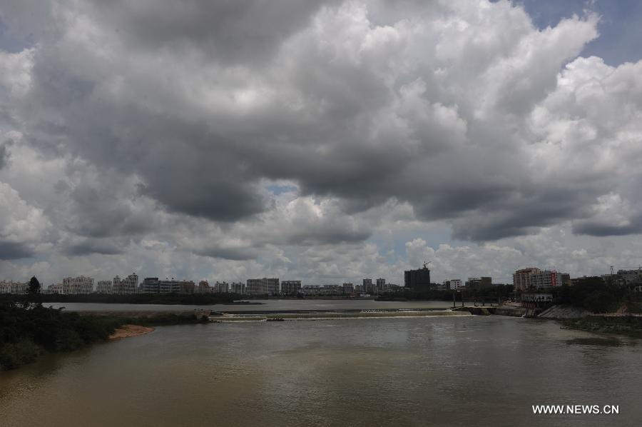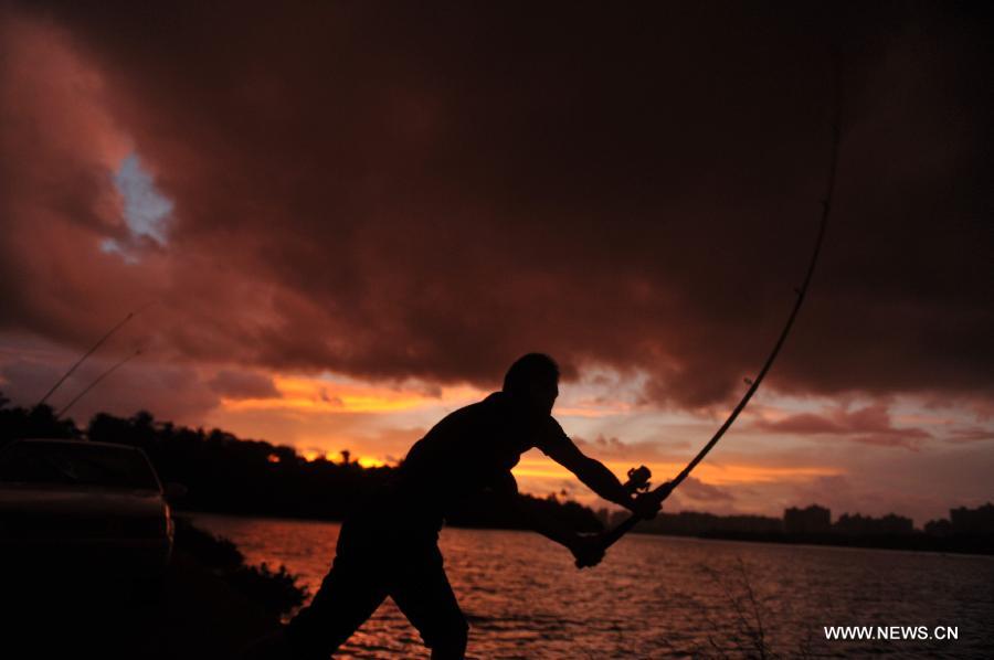 A man goes fishing by the Wanquan River under dark clouds in Qionghai City, south China's Hainan Province, Aug. 1, 2013. Tropical storm Jebi is expected to land in Hainan sometime Friday afternoon or night.(Xinhua/Meng Zhongde)