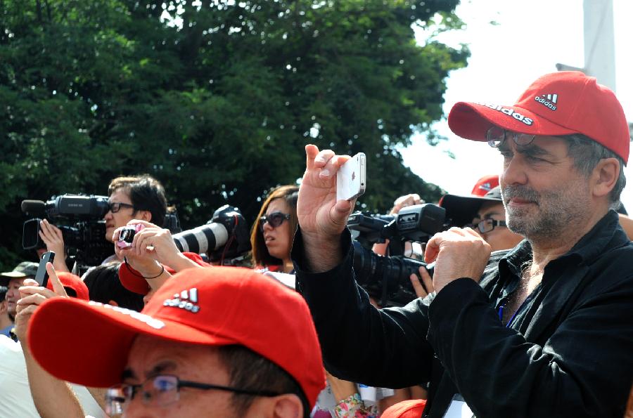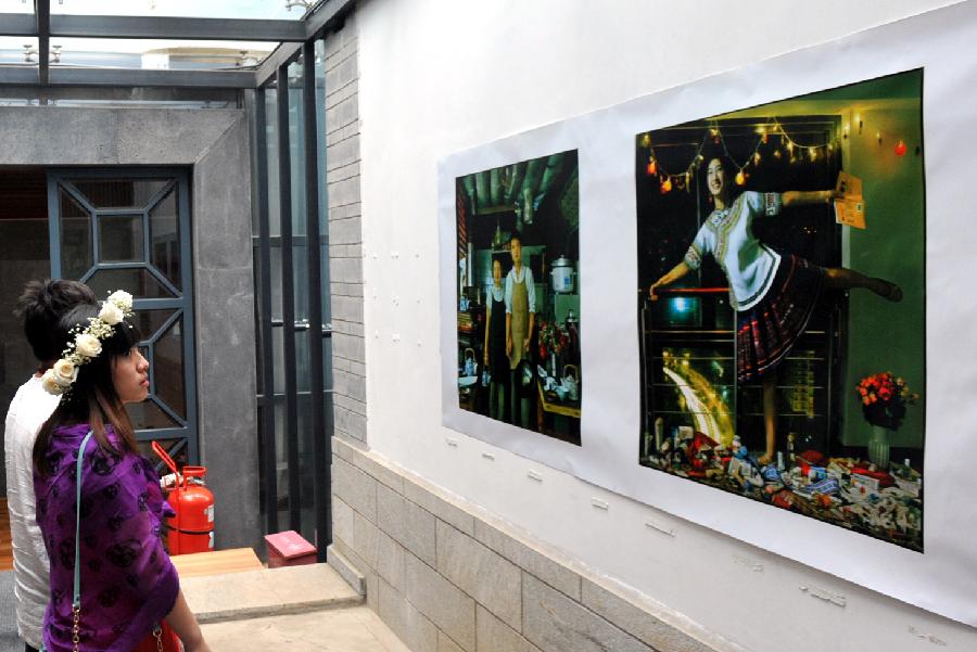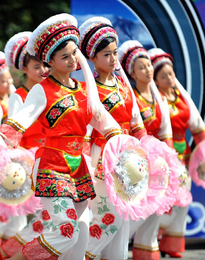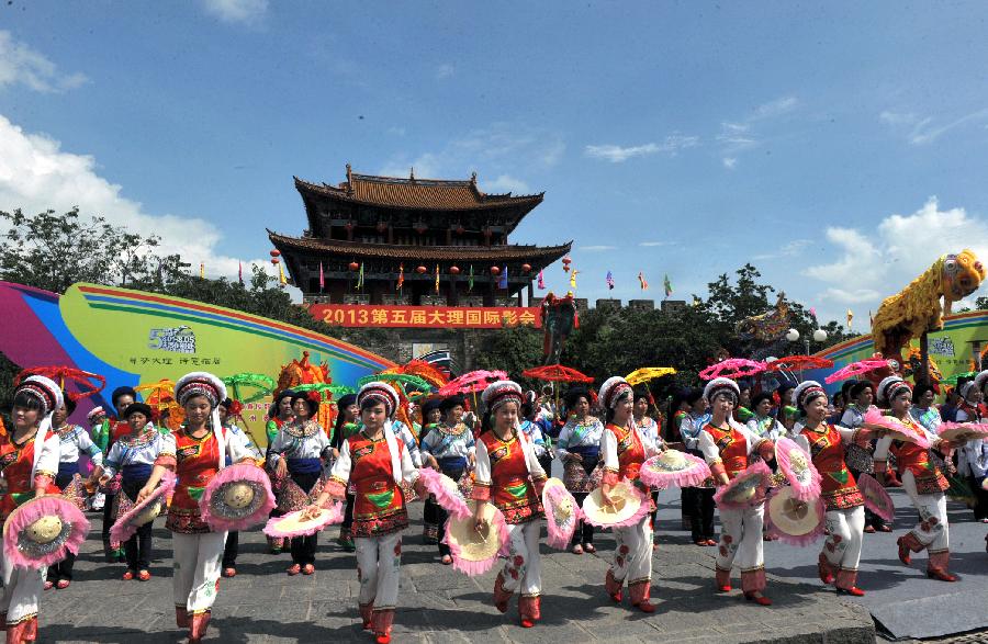 Young ladies of the Bai ethnic group perform their traditional dancing during the opening ceremony of the 5th Dali International Photography Exhibition in Dali, southwest China's Yunnan Province, Aug. 1, 2013. The five-day exhibition, which kicked off on Thursday, will display more than 6,000 photography works through over 200 themed exhibitions. (Xinhua/Chen Haining)
