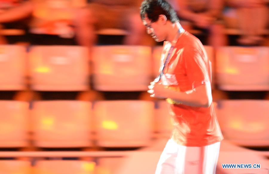 China's Sun Yang reacts after the final of the men's 1500-metre freestyle swimming competition in the FINA World Championships in Barcelona on Aug. 4, 2013. Sun Yang won the 3rd gold of World Championship with 1,500 meter freestyle triumph. (Xinhua/Xie Haining)