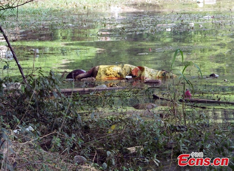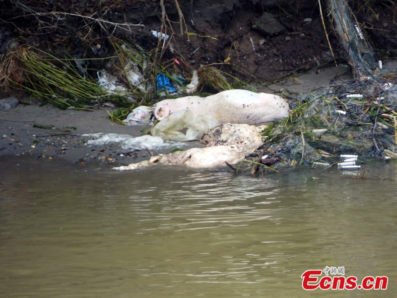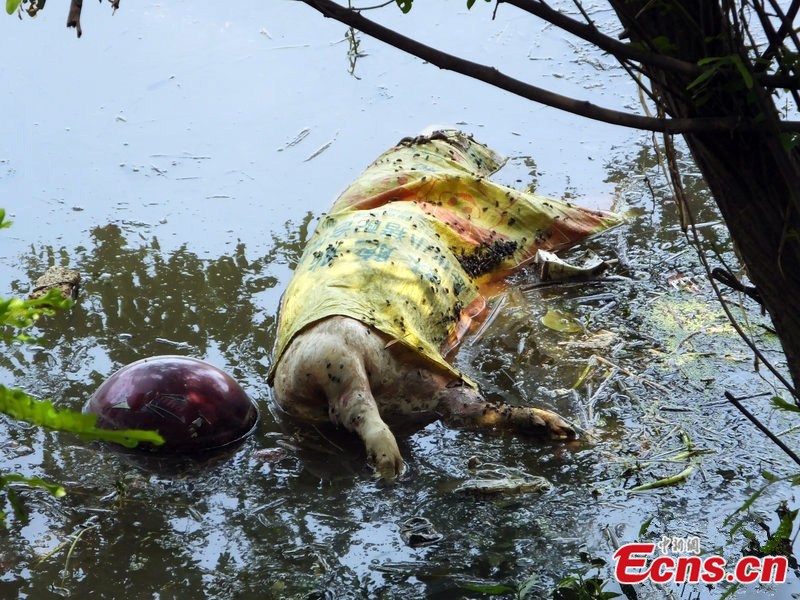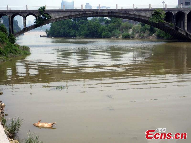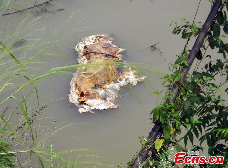 Photo taken on August 3 shows a dead pig floating in a river near Gezhouba Dam at Yichang City of central China's Hubei province. Tens of dead pigs were found rotting in the river. [Photo/CFP]