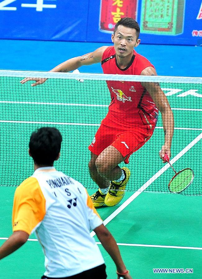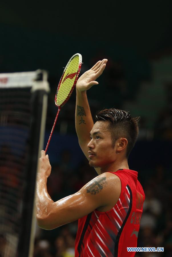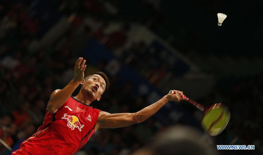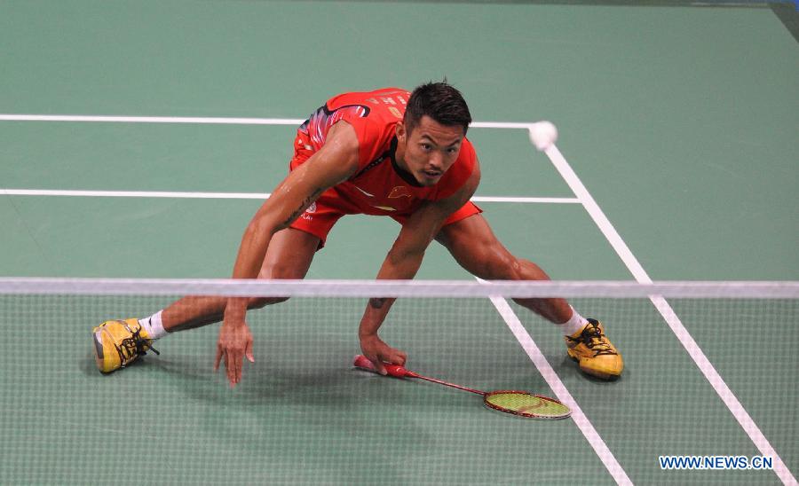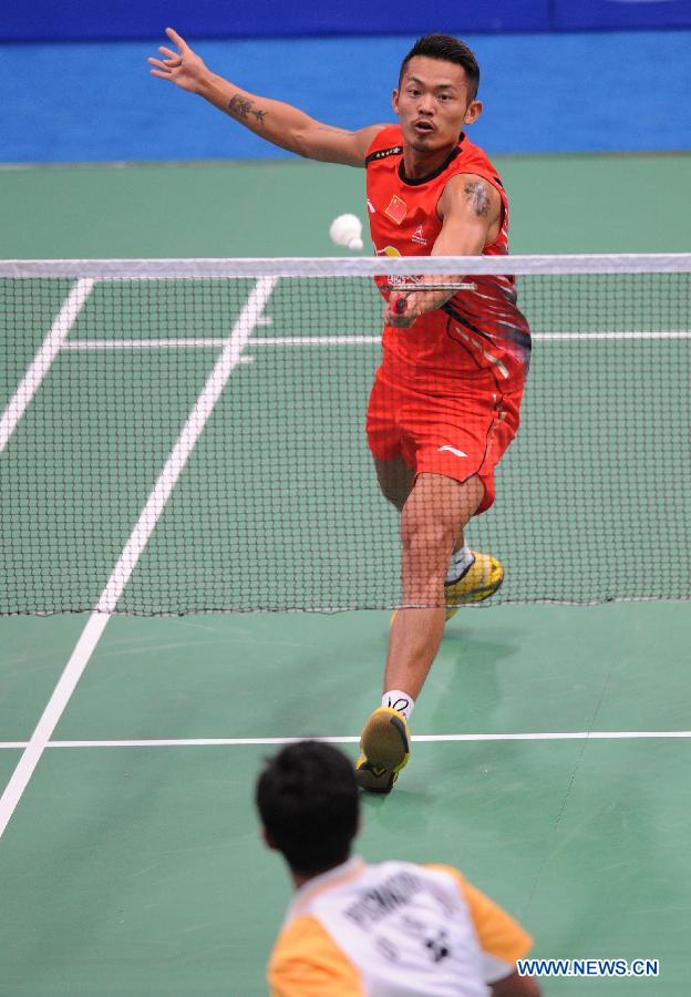 Lin Dan of China returns a shot during the men's singles 1st round match against Sattawat Pongnairat of the United States at the 2013 BWF World Championships on Aug. 5, 2013. Lin won 2-0. (Xinhua/Bai Xuefei)