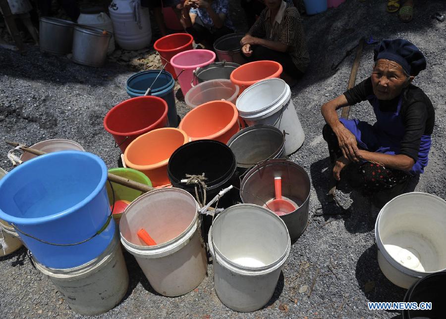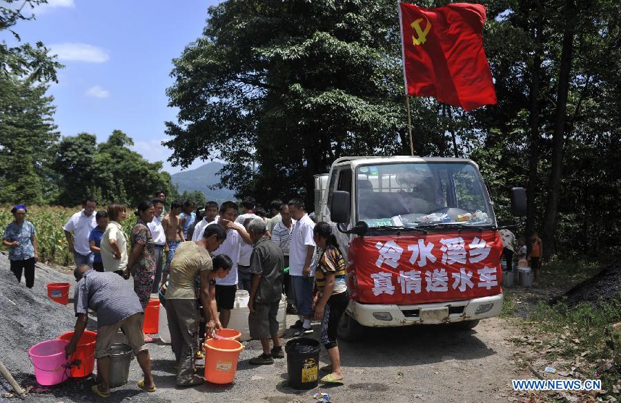 Villagers fetch drinking water sent by a truck at Shimen Village of Songtao County, southwest China's Guizhou Province, Aug. 6, 2013. A lingering drought has left about 2.25 million people short of drinking water in the province.(Xinhua/Ou Dongqu)