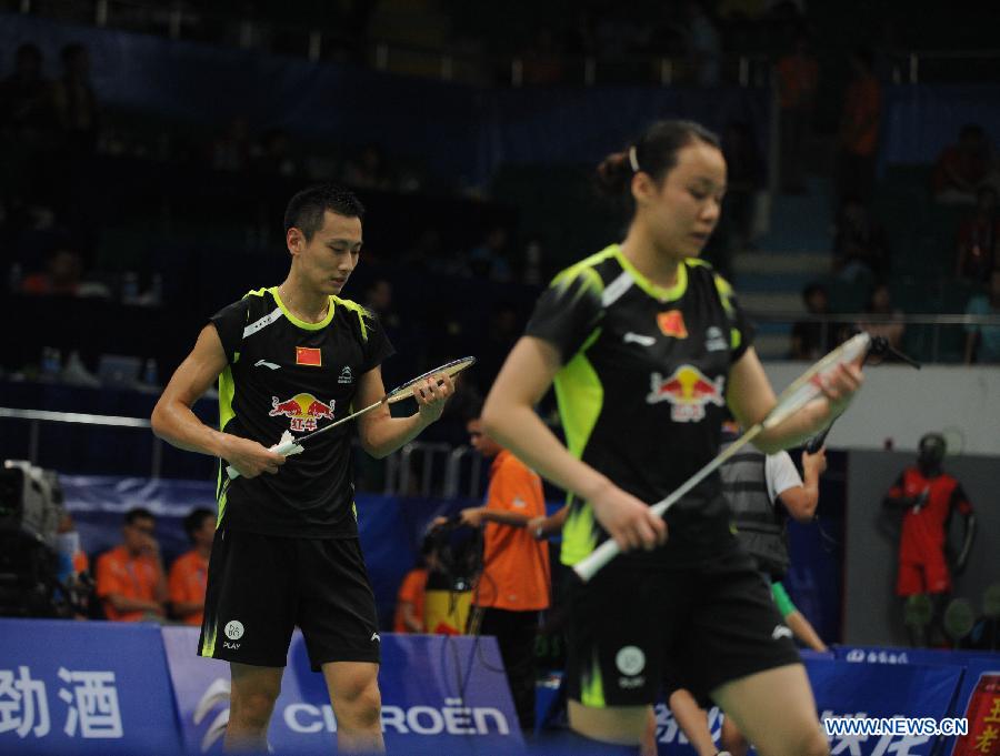 Zhang Nan (L) and Zhao Yunlei from China compete during the mixed double match against Anthony Dumarthery and Sabrina Jaquet of Swiss at the 2013 BWF World Championships on Aug. 6, 2013. Zhang Nan and Zhao Yunlei won 2-0. (Xinhua/Mao Siqian)