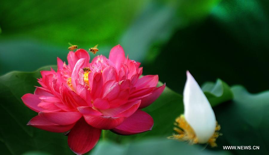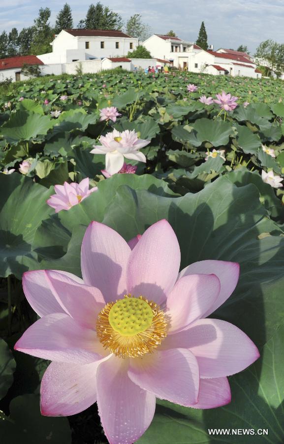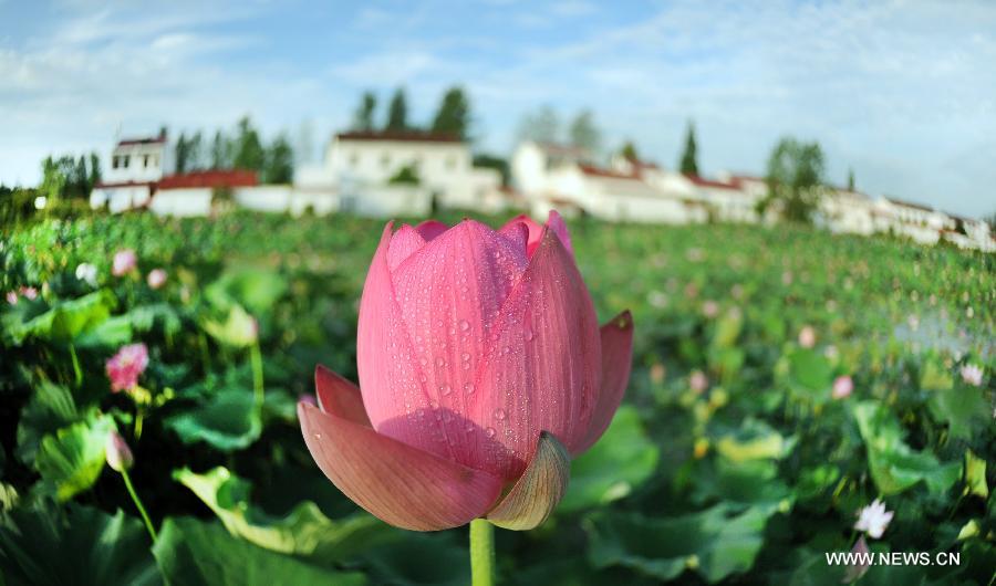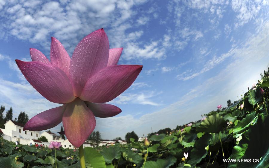 Photo taken on Aug. 4, 2013 shows a blossoming lotus flower at San'guaiwan village of Tangshu Township in Shucheng County, east China's Anhui Province. (Xinhua/Chen Li)